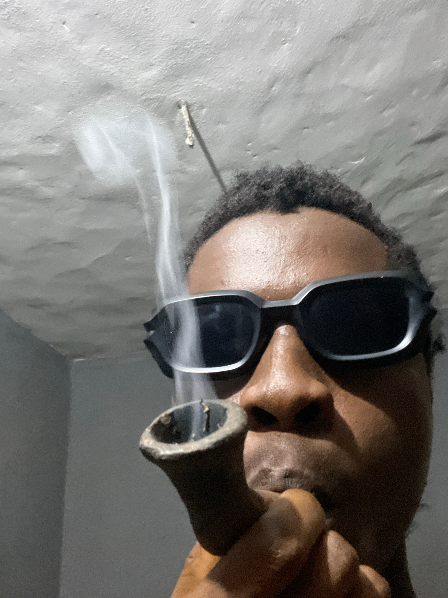 This close-up portrait, taken in Onitsha, Nigeria, features an individual with dark skin and dark, curly hair, viewed from the chest up. The person is wearing black sunglasses with silver frames, whic…read more