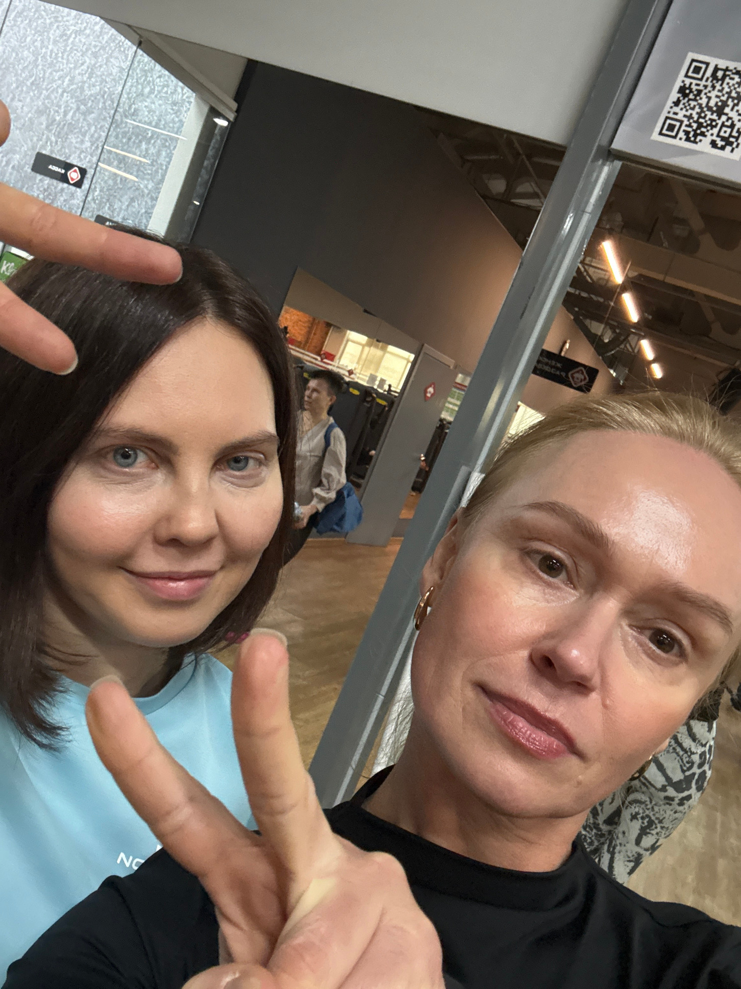 Two women are taking a selfie indoors. The woman at the top has short, blonde hair and is wearing a black shirt. The woman at the bottom has shoulder-length brown hair and is wearing a light blue shir…read more