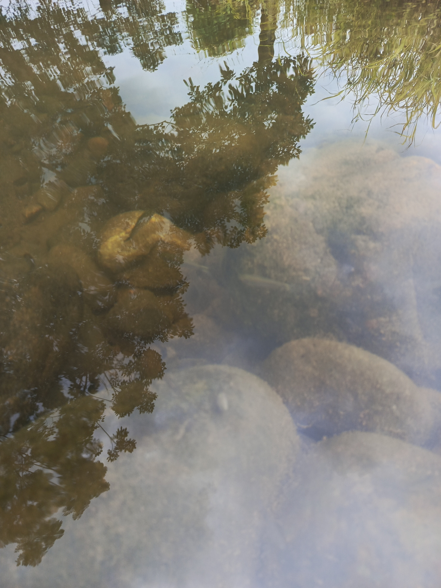 The image shows a body of water, possibly a stream or river, with large, rounded rocks visible beneath the surface. The water is clear enough to see the rocks, but also has a slightly murky or cloudy…read more