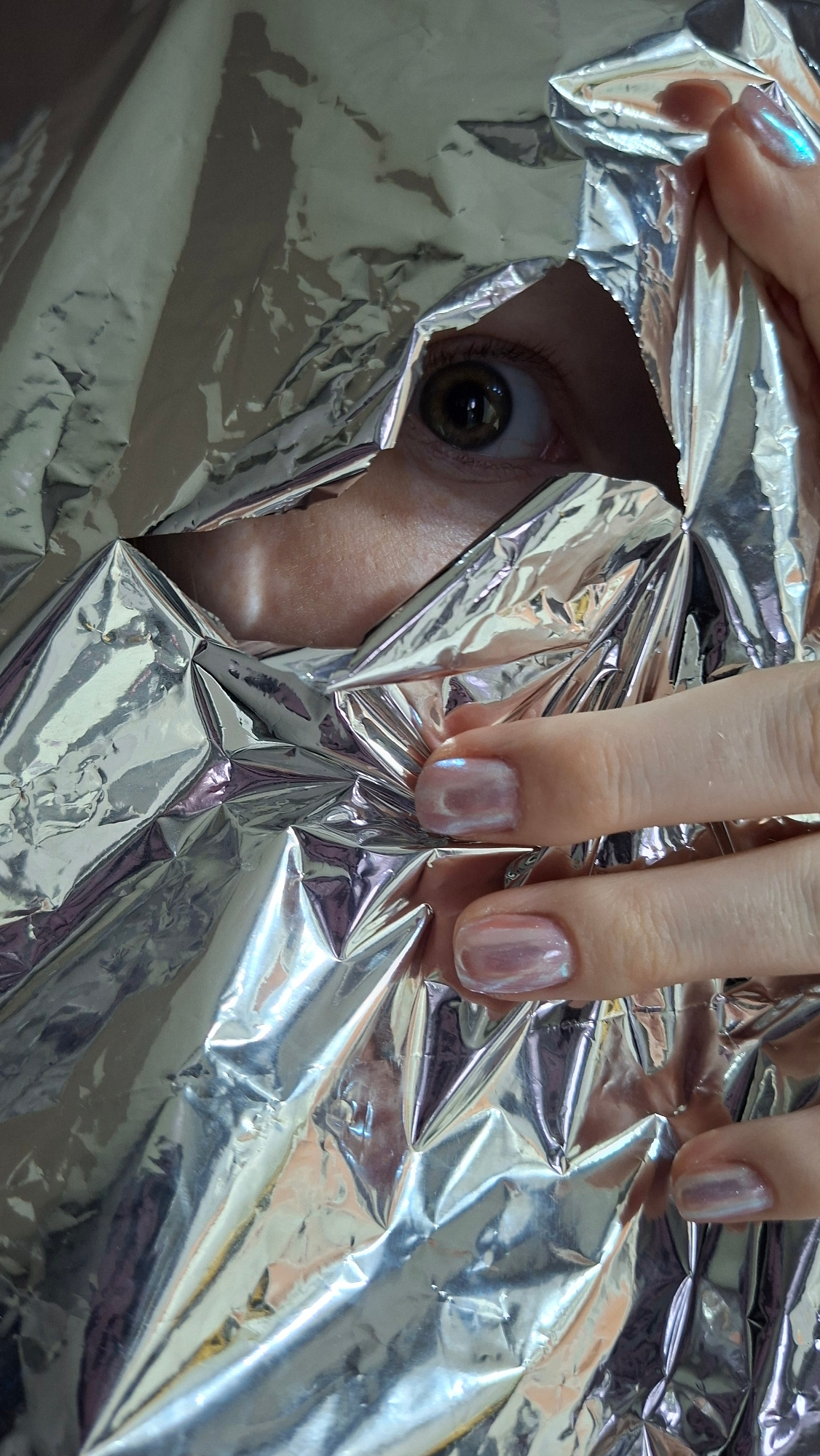 A person is seen peering through a hole in a sheet of shiny, reflective material (possibly aluminum foil). Only one eye is visible, along with part of the face around the eye. A hand with painted fing…read more