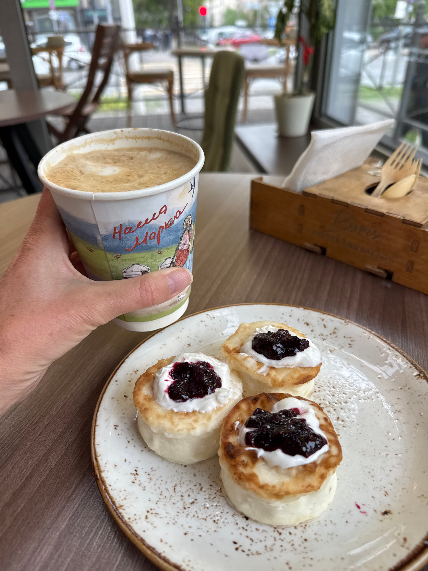The image captures a first-person perspective of a cafe setting, likely in Bishkek City, Kyrgyzstan, focused on a breakfast or snack. In the immediate foreground, a hand holds a paper coffee cup fille…read more