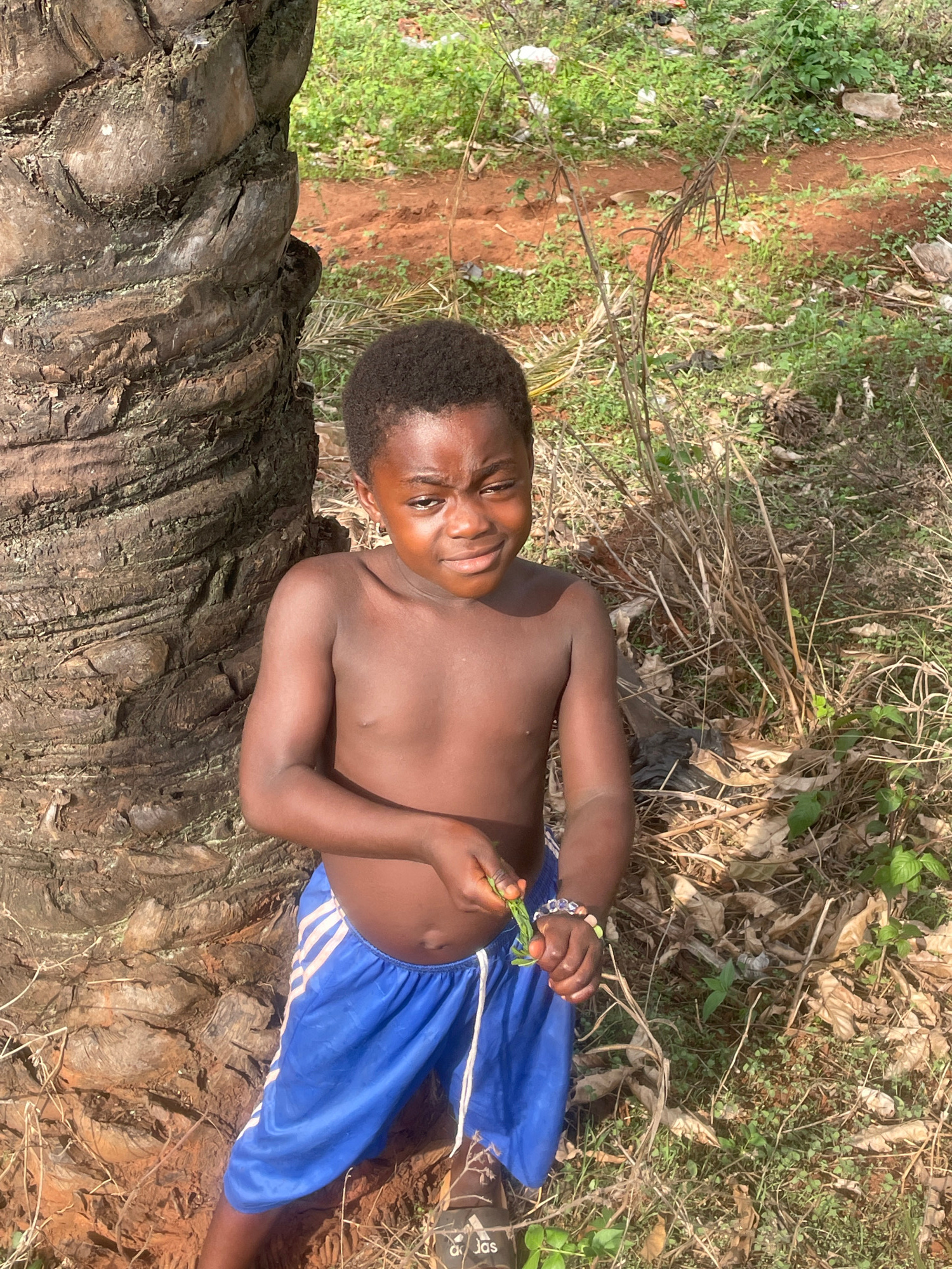 A young, shirtless, dark-skinned boy lies on a fallen tree trunk in what appears to be a natural outdoor setting in Ogbe, Nigeria. He is wearing blue shorts with white stripes. He is holding green leaβ¦read more