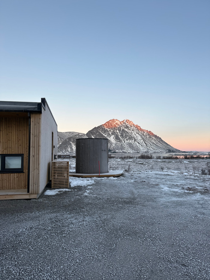 The image depicts a winter scene in Kleppstad, Norway, under a clear sky during either sunrise or sunset, evidenced by the low-angle, warm light illuminating distant mountain peaks. In the foreground,…read more