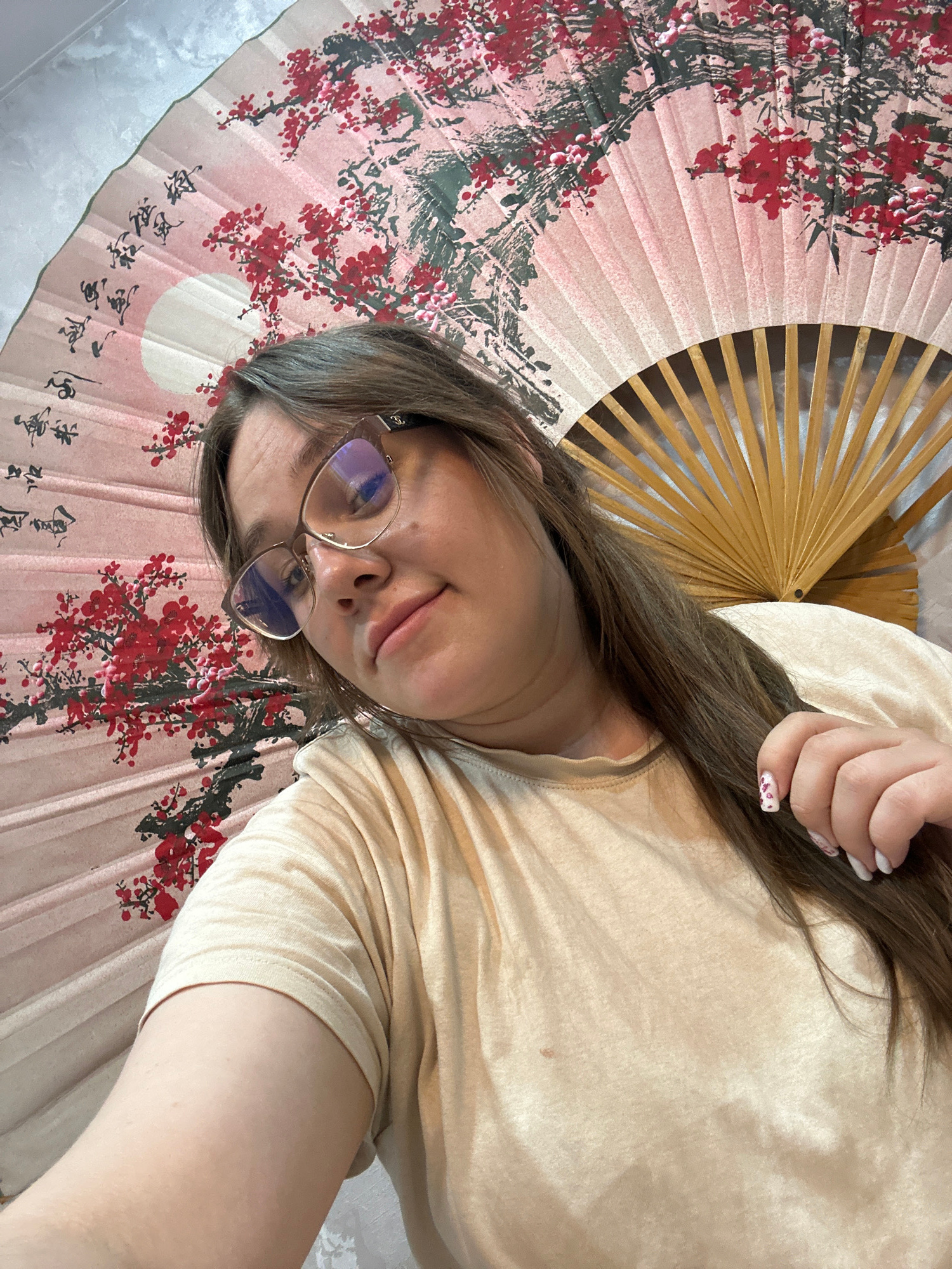 A woman lies on a patterned fan, positioned on a light gray surface. The fan is two-toned, combining a light pink section adorned with red cherry blossoms and black calligraphy with a natural-colored…read more