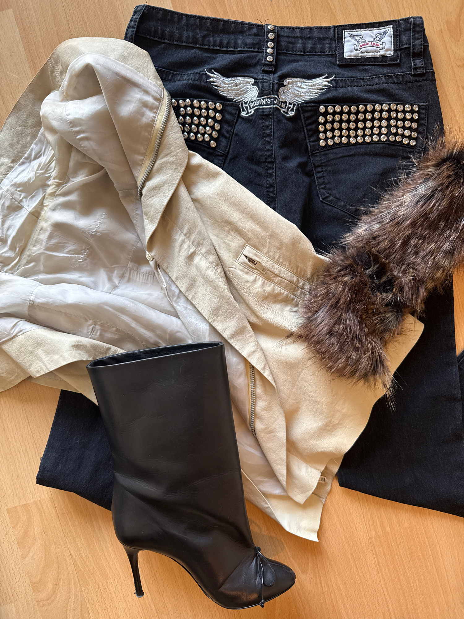 This media file presents a flat lay of fashion items arranged on a light wooden floor. The central subjects are a pair of black denim jeans, a cream-colored jacket, and a black high-heeled boot. Theβ¦read more