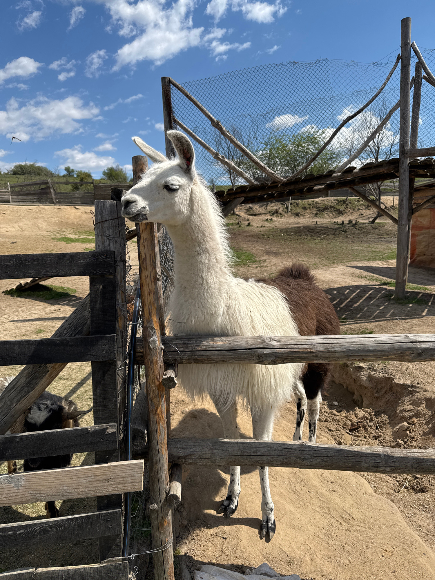 A llama lies down behind a rough-hewn wooden fence in a fenced-in outdoor area. The llama has a white head and neck, and brown fur on its back. Its legs, visible through the fence, are spotted. Behind…read more
