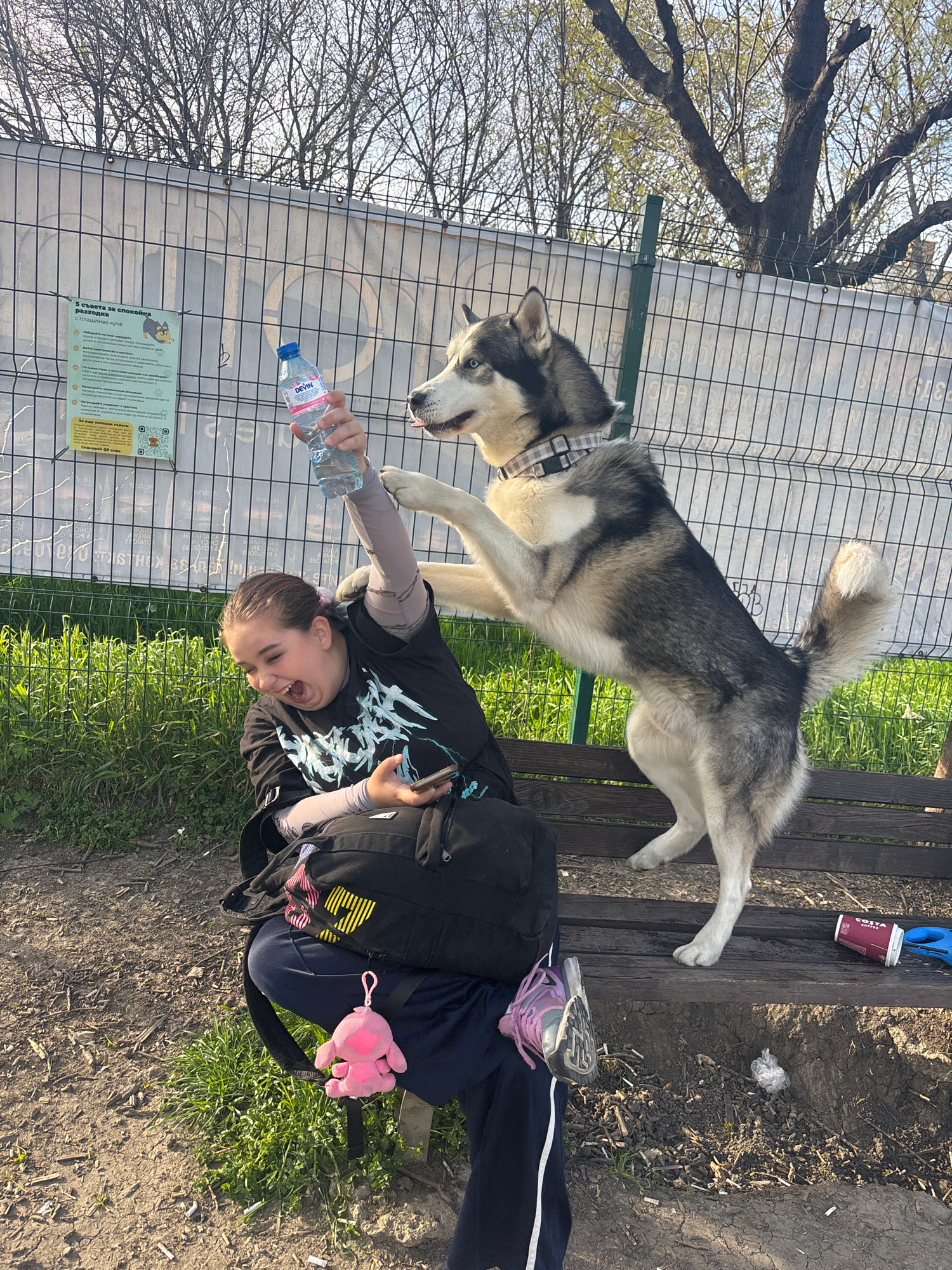 A woman is seated on a wooden bench in what appears to be a park or recreational area. She is dressed in a black shirt and dark pants. She is holding a plastic water bottle. A large husky-like dog wit…read more