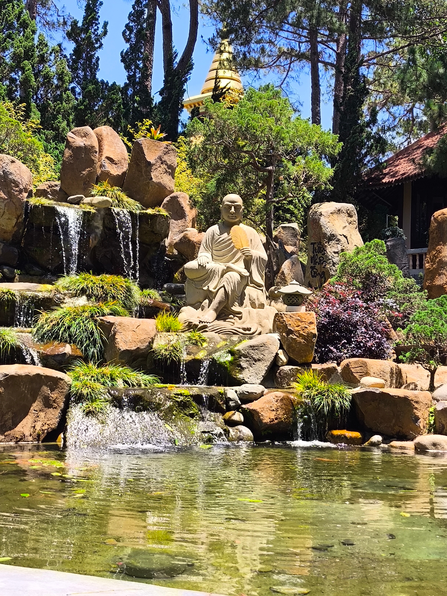 The image shows a Buddhist statue in a tiered garden at the Truc Lam Pagoda in Da Lat, Vietnam. The statue sits cross-legged holding a fan near a man-made waterfall that flows into a pond in the foreg…read more