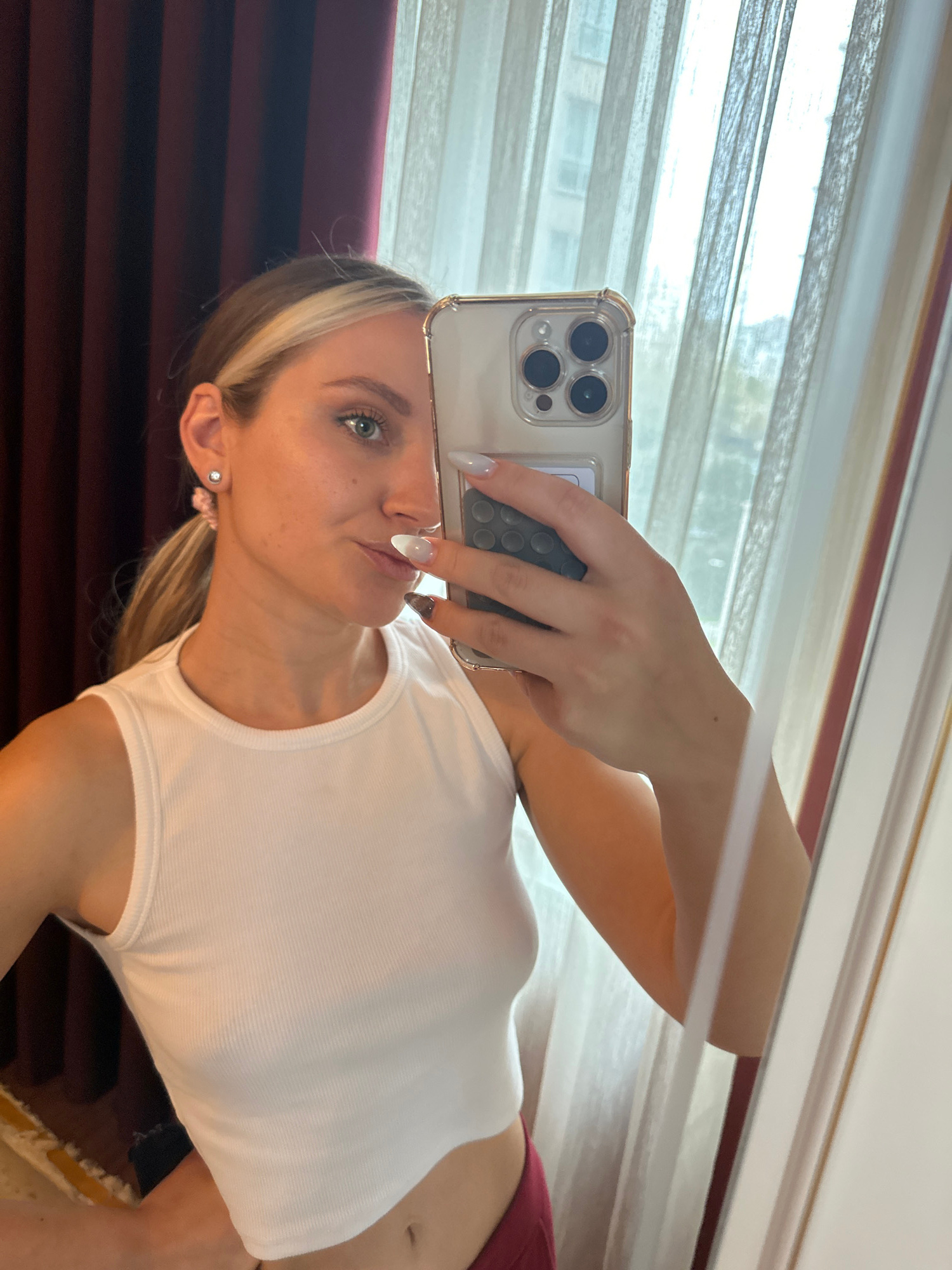A woman is taking a selfie using an iPhone in a mirror. She has blonde hair with lighter highlights framing her face. She is wearing a white tank top and red bottoms. The background includes a windowβ¦read more