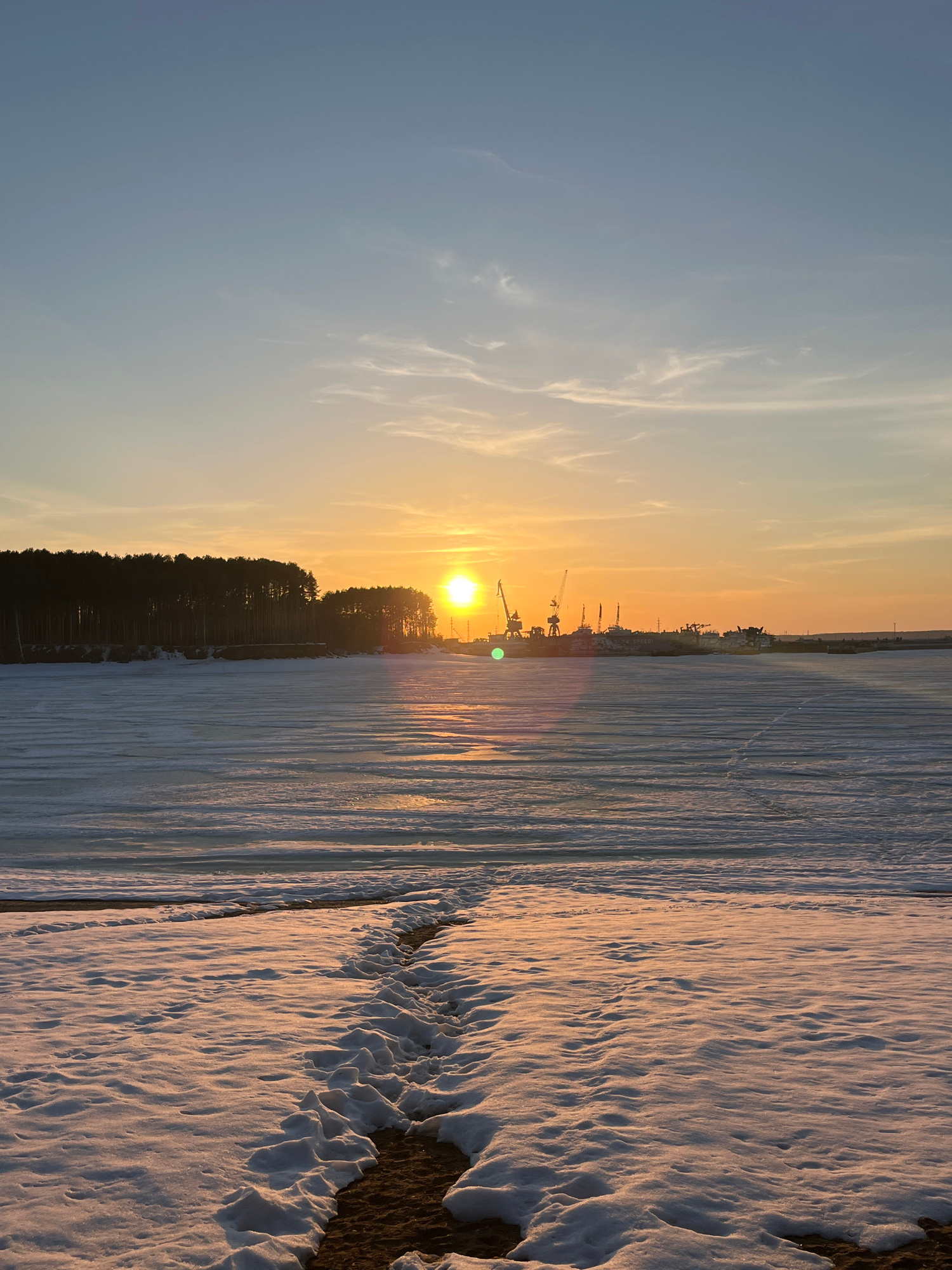 The image captures a winter sunset over a snowy landscape. The location is likely near Chaikovsky, Russia, indicated by the presence of cranes and industrial structures in the distance along the skyli…read more