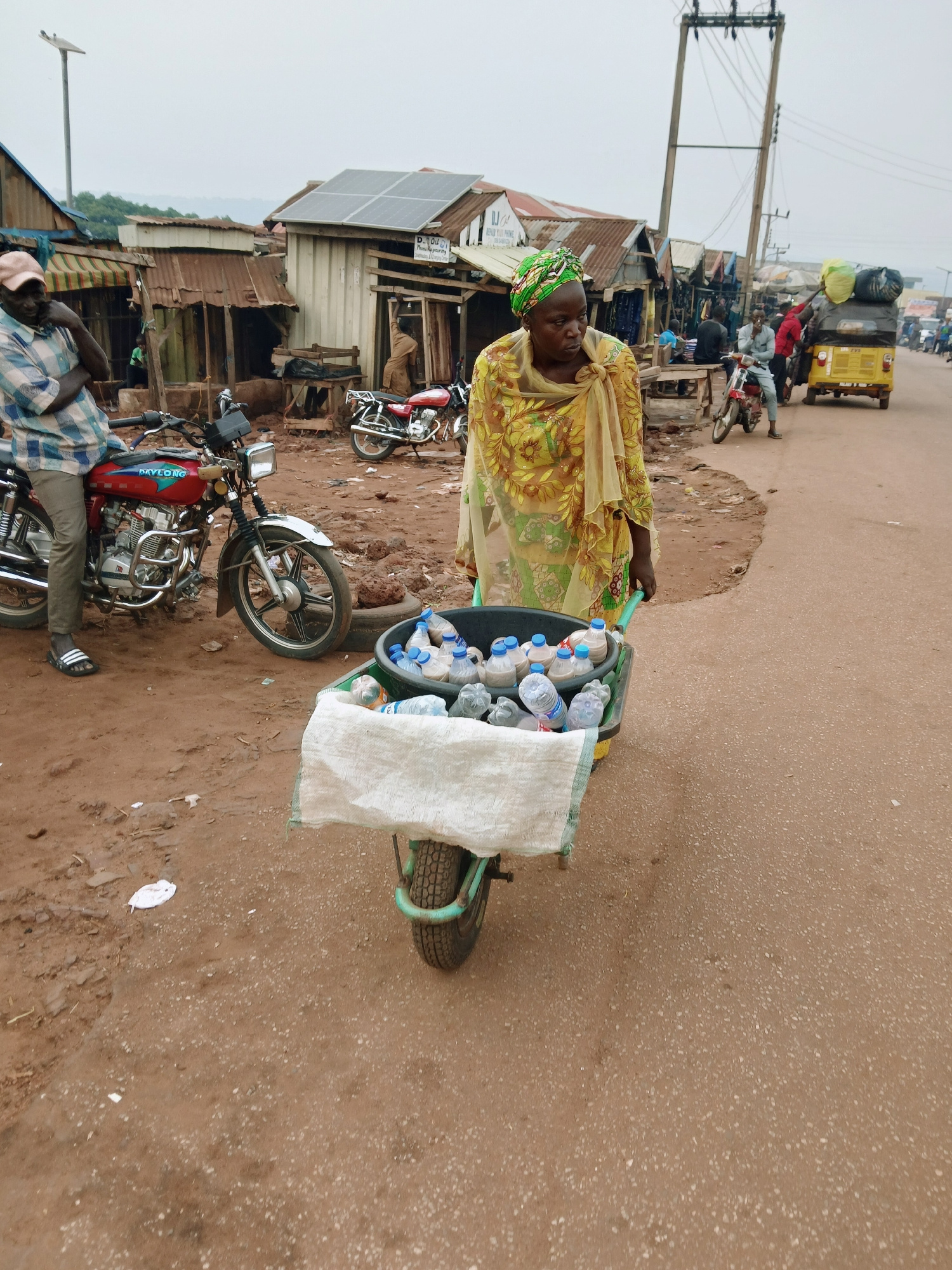 The image depicts a woman wearing a yellow patterned dress and a colorful headwrap, pushing a three-wheeled cart filled with plastic water bottles in Ankpa, Nigeria. The woman appears to be selling th…read more