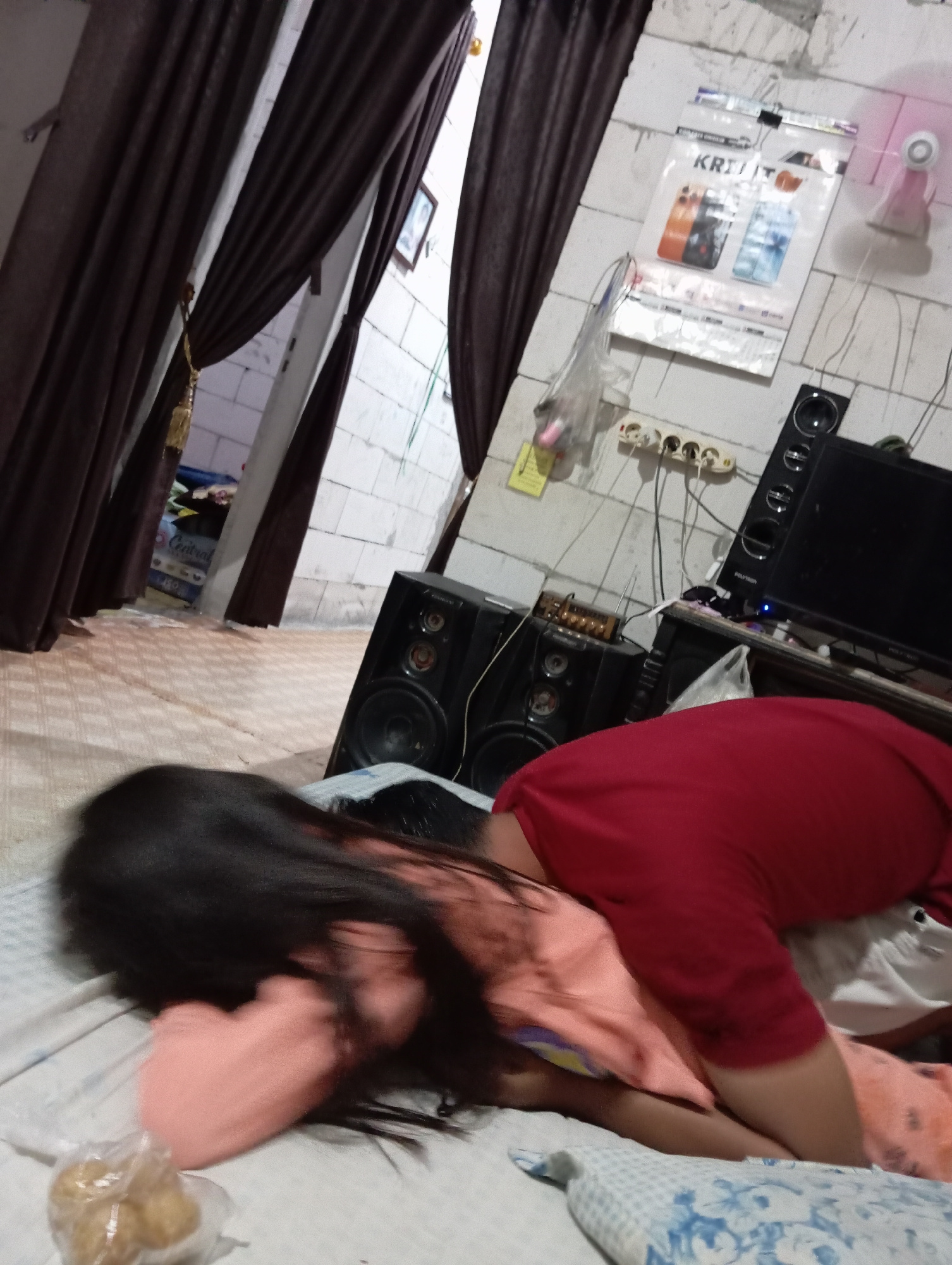 A tilted indoor shot depicts a person lying face down on a patterned bed, wearing a red long-sleeved shirt and peach-colored attire. A plastic bag with indistinct contents lies on the bed beside them.…read more
