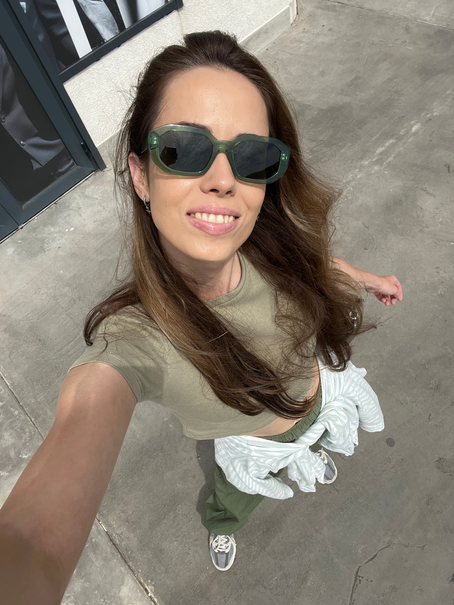 The image displays a young woman taking an upward-angled selfie outdoors in Bjeliši, Montenegro. She is the main subject, positioned with her head and upper torso filling the top left and center of th…read more