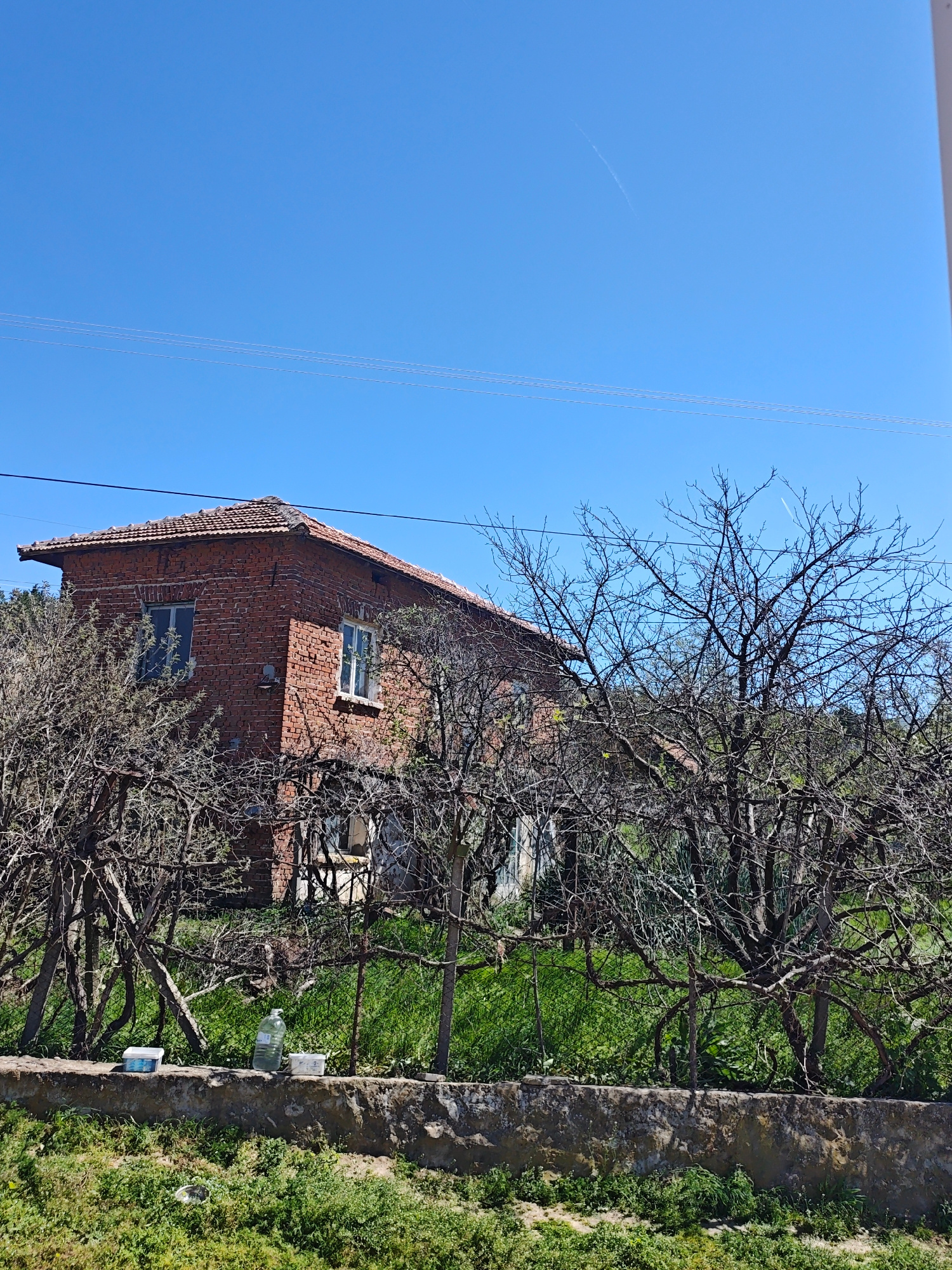 A low-angle, wide shot shows a weathered brick house behind a wall and bare trees, set against a clear blue sky. Overhead wires run horizontally across the upper part of the frame. The house has a re…read more