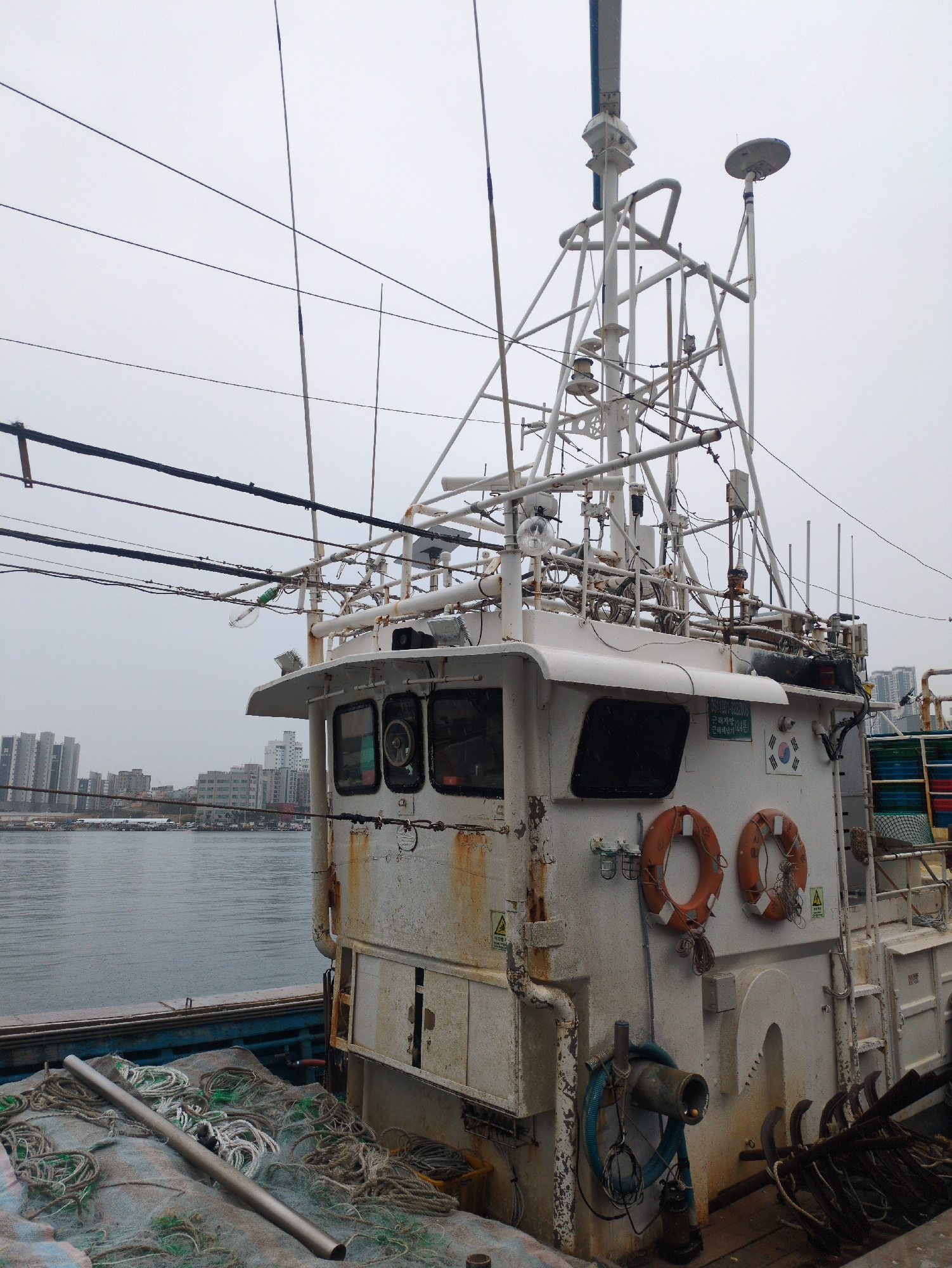 The image displays the port side of a fishing vessel, likely a fisheries guidance or patrol boat, docked or at anchor in a harbor near a city. The setting is Ulsan, South Korea, identifiable by a Sout…read more