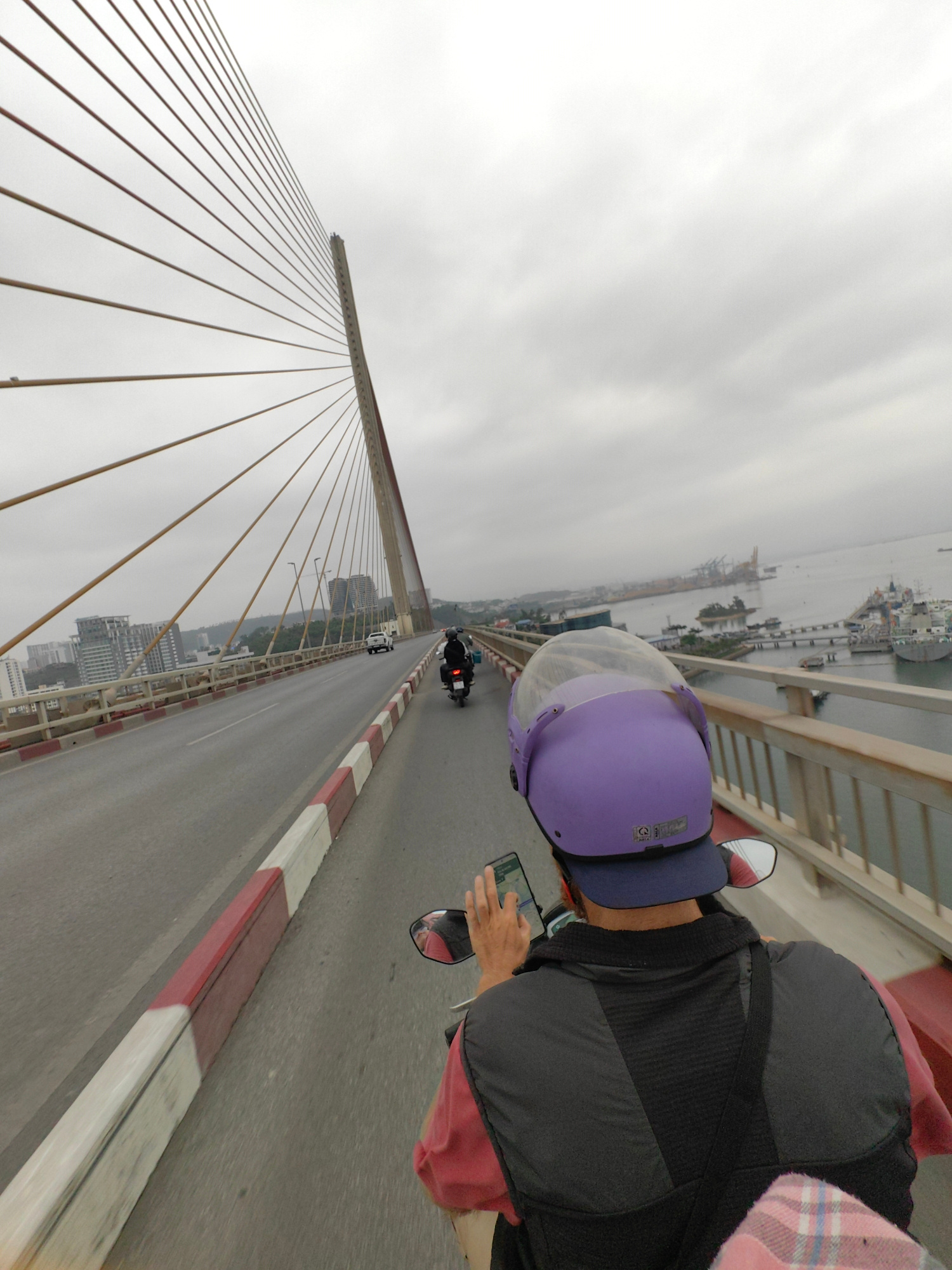 The image shows a person riding a motorcycle across a bridge in Hong Gai Ward, Vietnam, as indicated by the cityscape and port facilities visible in the background. The person is wearing a purple helm…read more