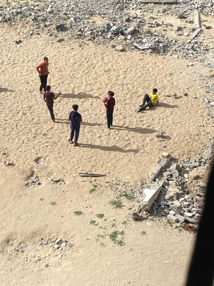 An overhead, high-angle shot captures five individuals, likely young males, engaged in activity on a sandy, open ground. The scene is dominated by the light brown sand, which exhibits ripples and text…read more