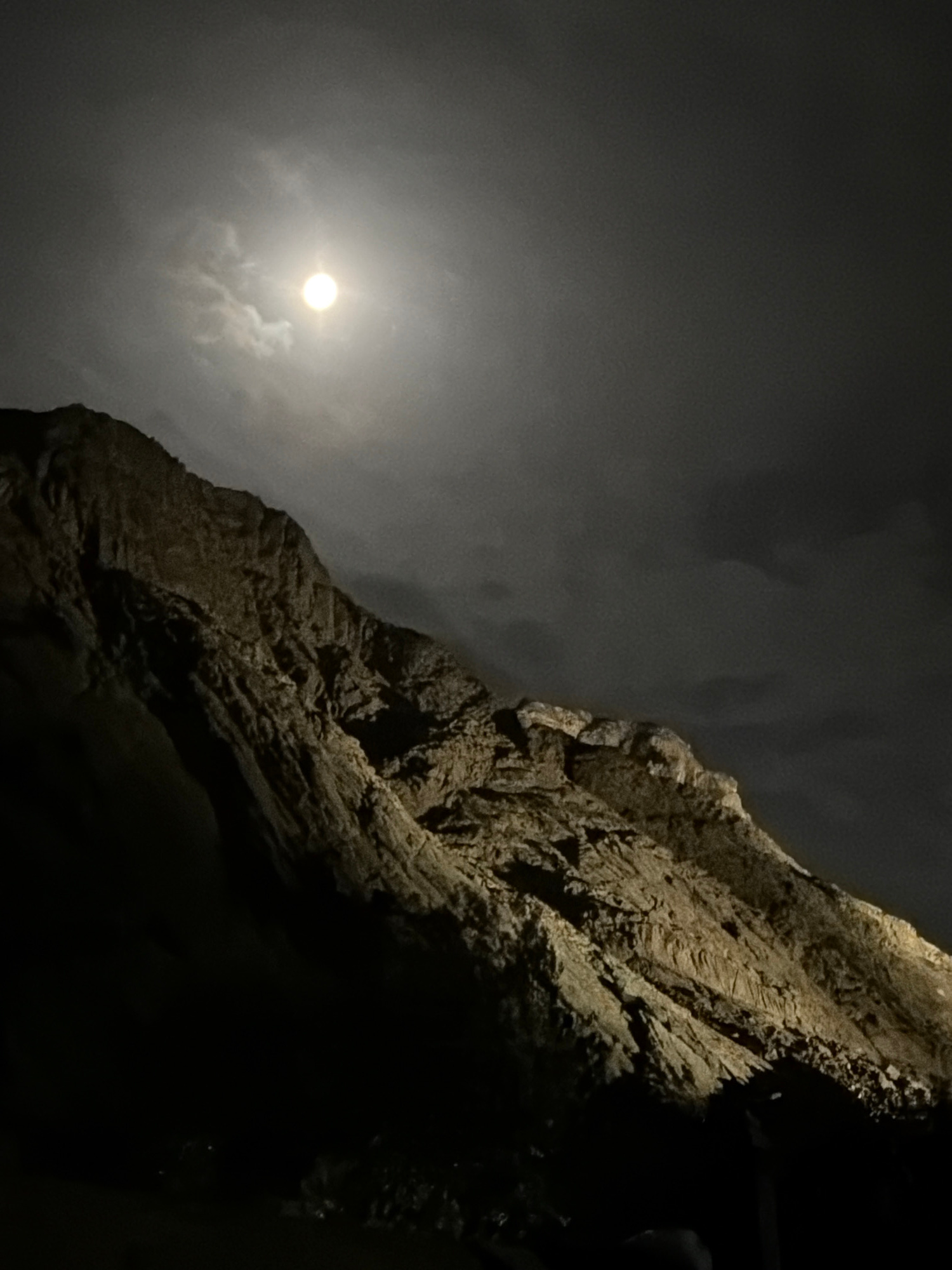 A night scene in Saint Catherine, Egypt, featuring a rocky mountain illuminated on its right side. To the left, a bright moon is visible through cloudy skies. The mountain's texture is rough and uneve…read more