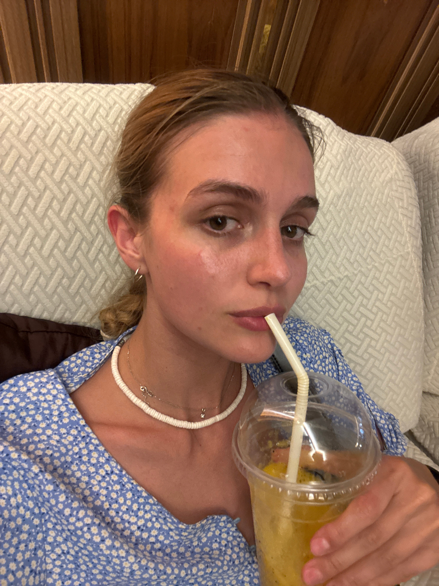 The image depicts a woman lying on a patterned off-white cushion or sofa, wearing a blue floral-patterned top. She is drinking from a clear plastic cup with a yellow beverage, likely a smoothie, using…read more