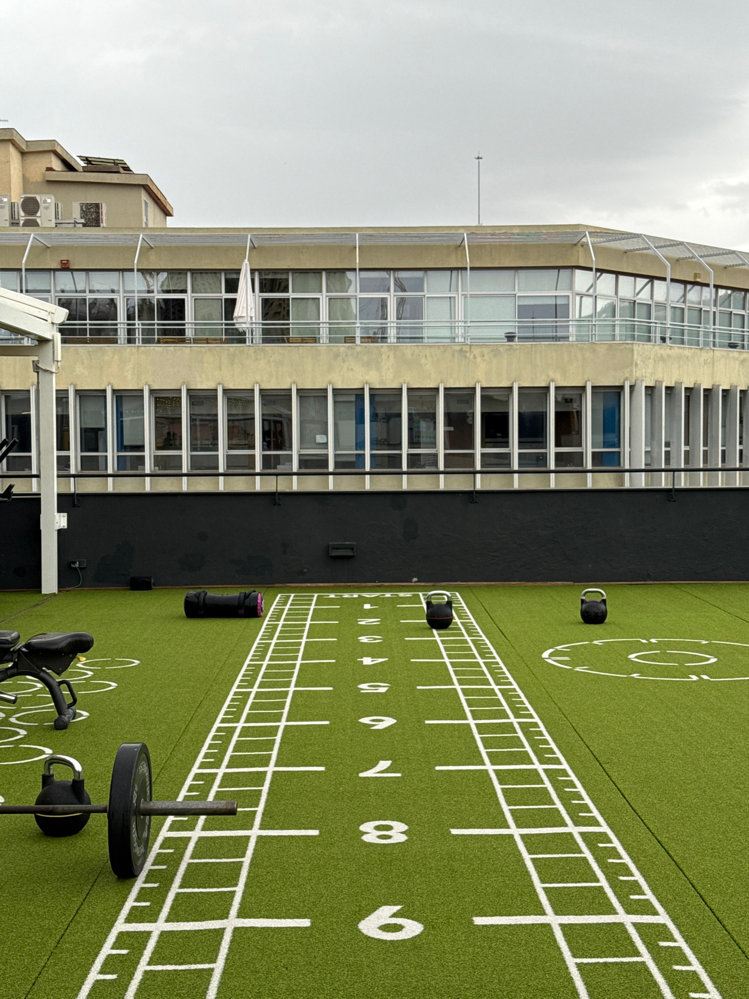 The image shows a rooftop gym area in Barcelona, Spain. The foreground displays green artificial turf marked with white lines and numbers resembling a workout grid. Various gym equipment is scattered…read more