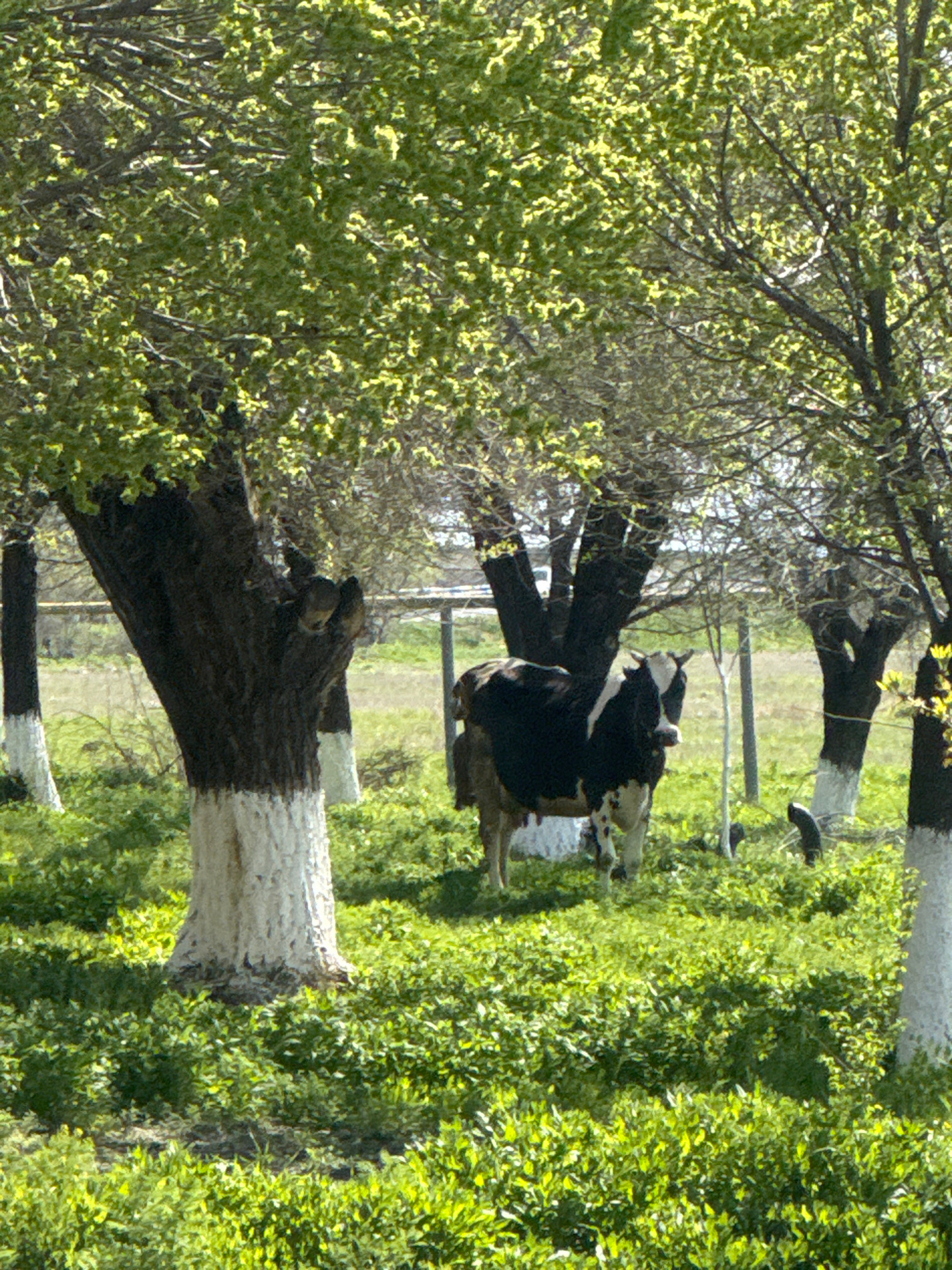 The image displays a vibrant outdoor scene, likely a pastoral landscape in Vagharshapat, Armenia, bathed in bright sunlight. The foreground and left side are dominated by several deciduous trees, abun…read more