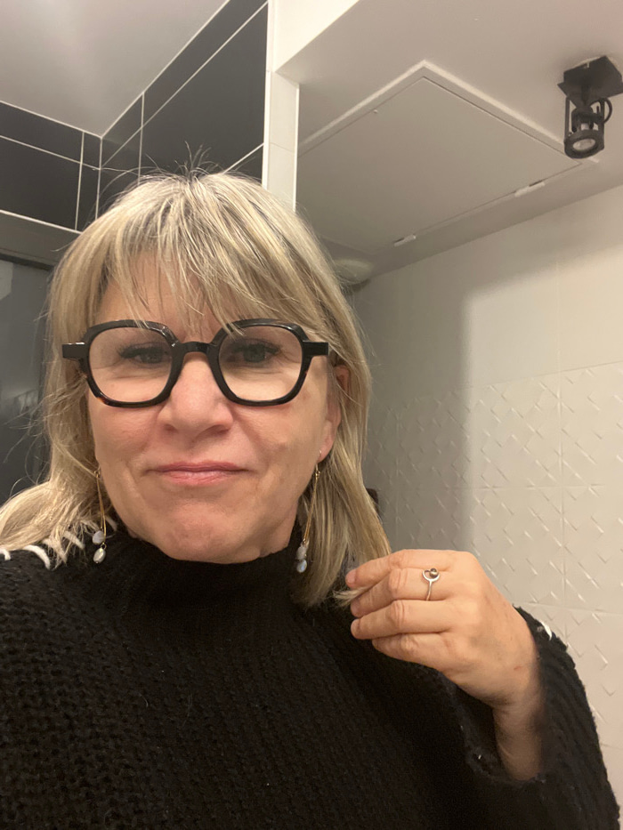 A woman with blond hair and black glasses faces the camera. She is wearing a dark sweater and earrings. Her right hand is raised with a ring on her finger. The background features a white tiled wall w…read more