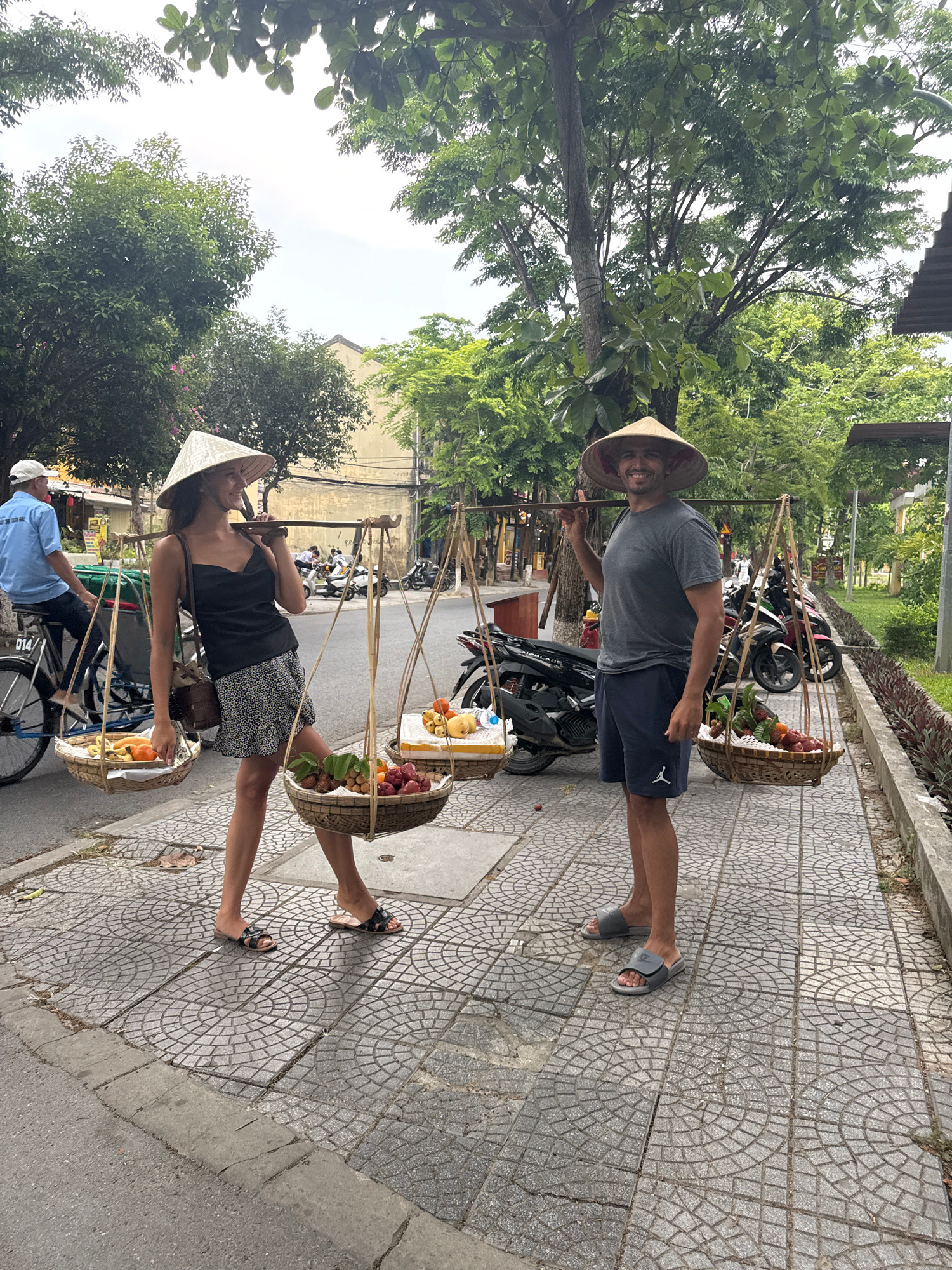 The image captures two people, a man and a woman, posing on a patterned tiled sidewalk in what appears to be a lively street scene in Hội An Ward, Vietnam. Both are wearing traditional Vietnamese coni…read more