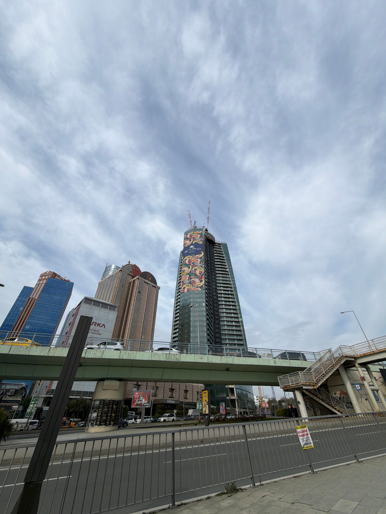 Captured from a low angle, the image shows a collection of buildings in Sarıyer, Turkey, set against a cloudy sky. Four distinct structures are visible, including a skyscraper partially covered with d…read more