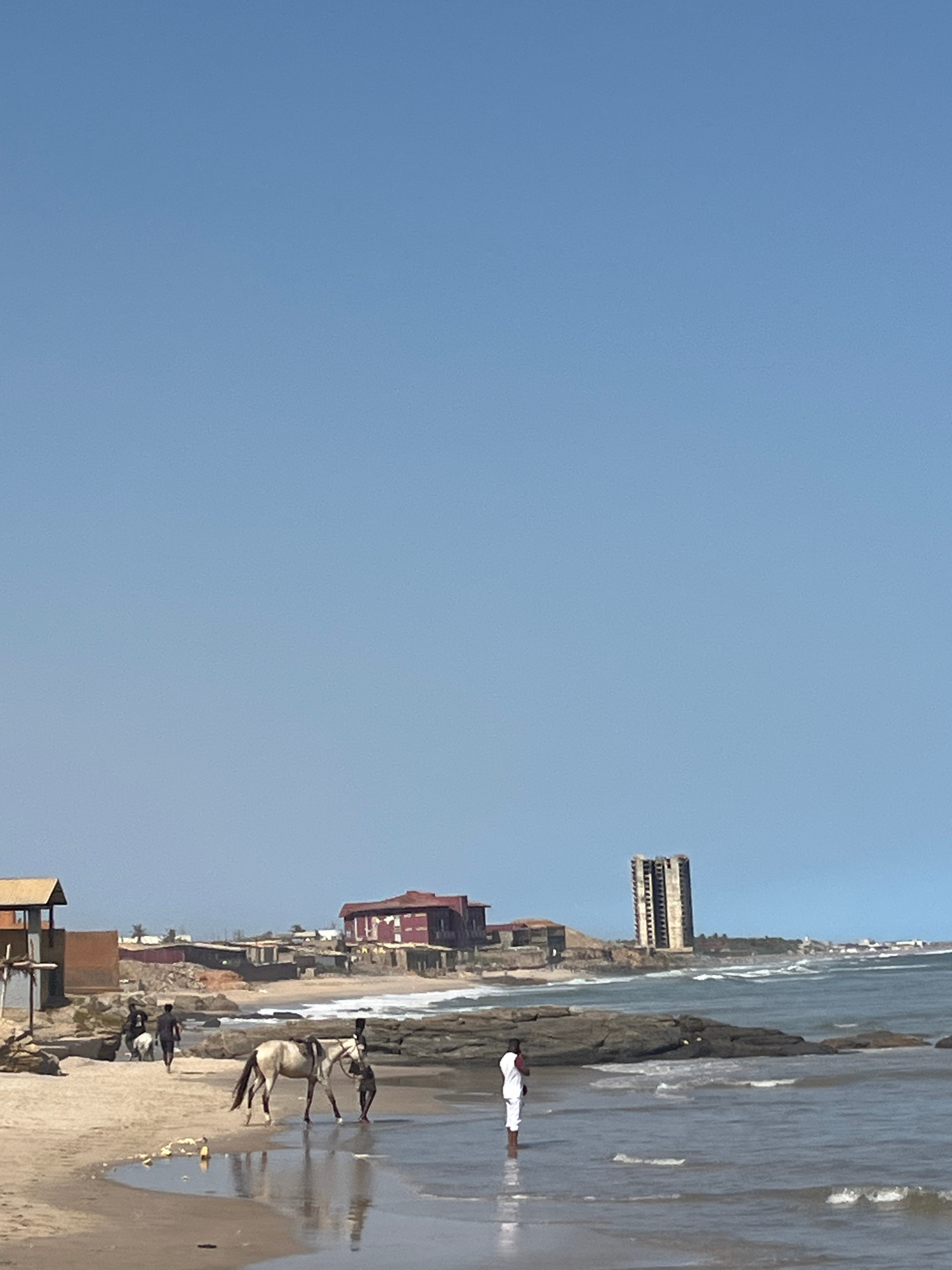 The image depicts a beach scene on a clear day, likely near Accra, Ghana, although the specific location is not discernible. A tall building can be seen in the background of the image on the shorelineβ¦read more