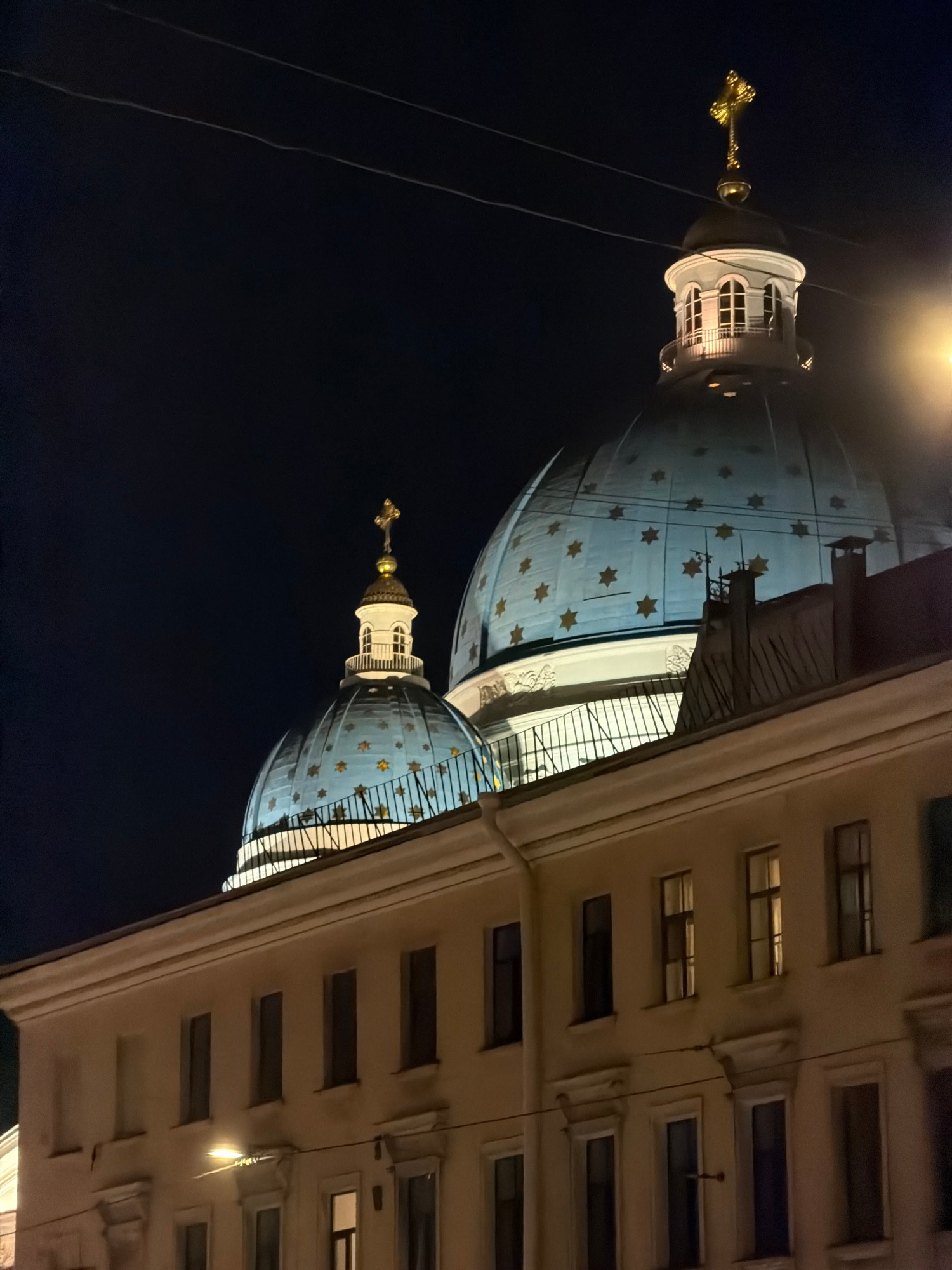The image shows a nighttime view of the dome of St. Isaac's Cathedral in Saint Petersburg, Russia, reflecting in a building's windows. The dome is decorated with gold stars and is topped with a small,…read more