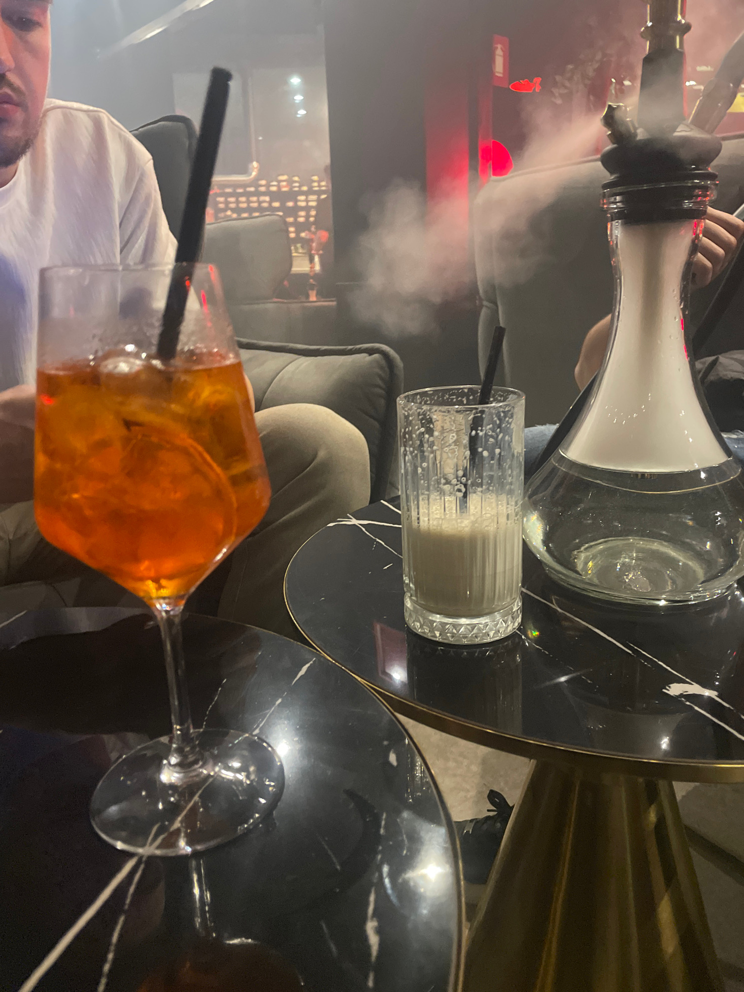 A dimly lit interior setting appears to be a lounge or bar, potentially in Varna, Bulgaria. Smoke hangs in the air, possibly from a hookah visible in the upper left, held by an unseen person. On a blaβ¦read more