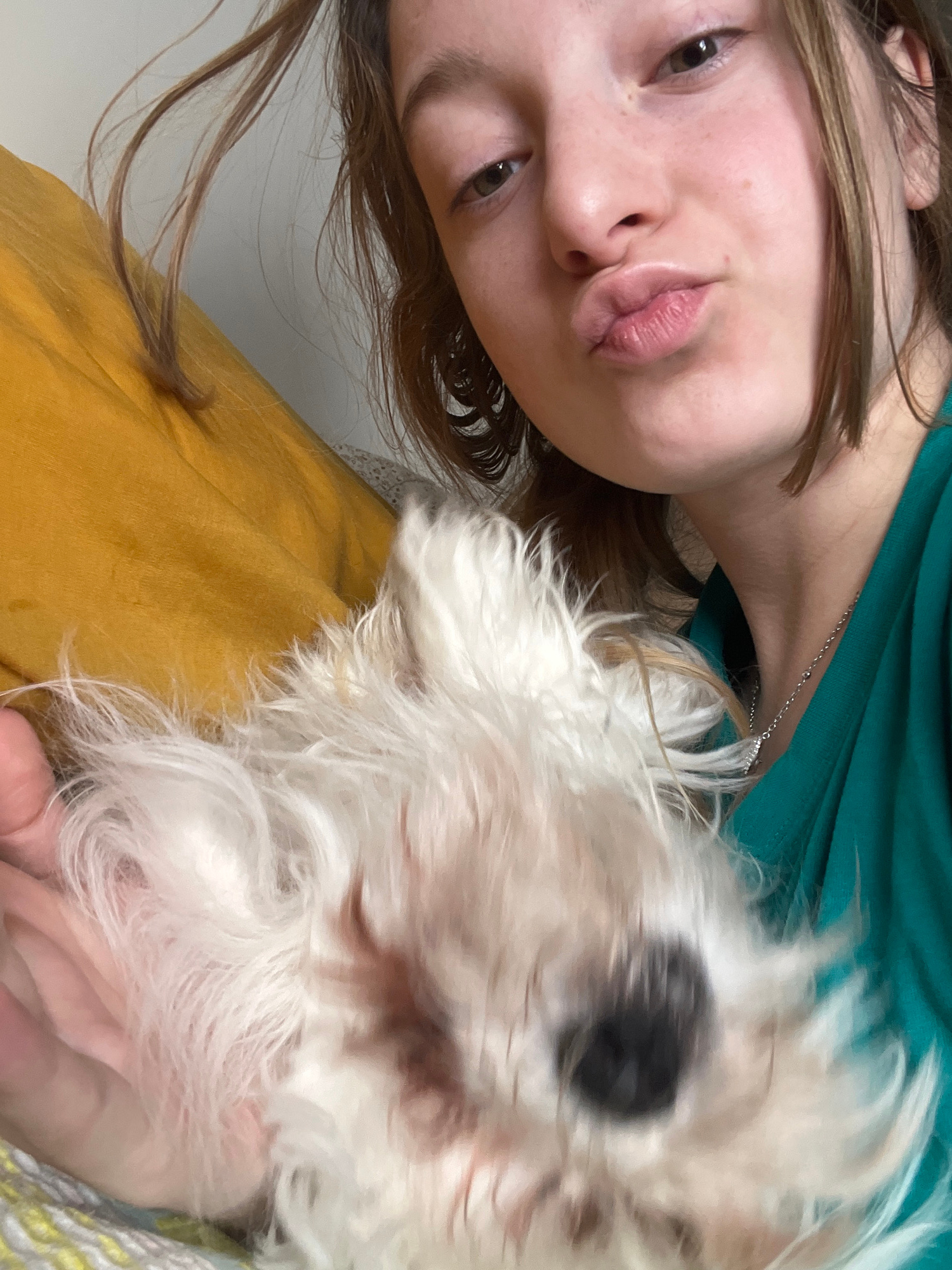 A selfie-style photograph shows a young woman with light brown hair and fair skin. Her face is tilted towards the camera, and she is making a slight kissing expression. She is wearing a green top andβ¦read more