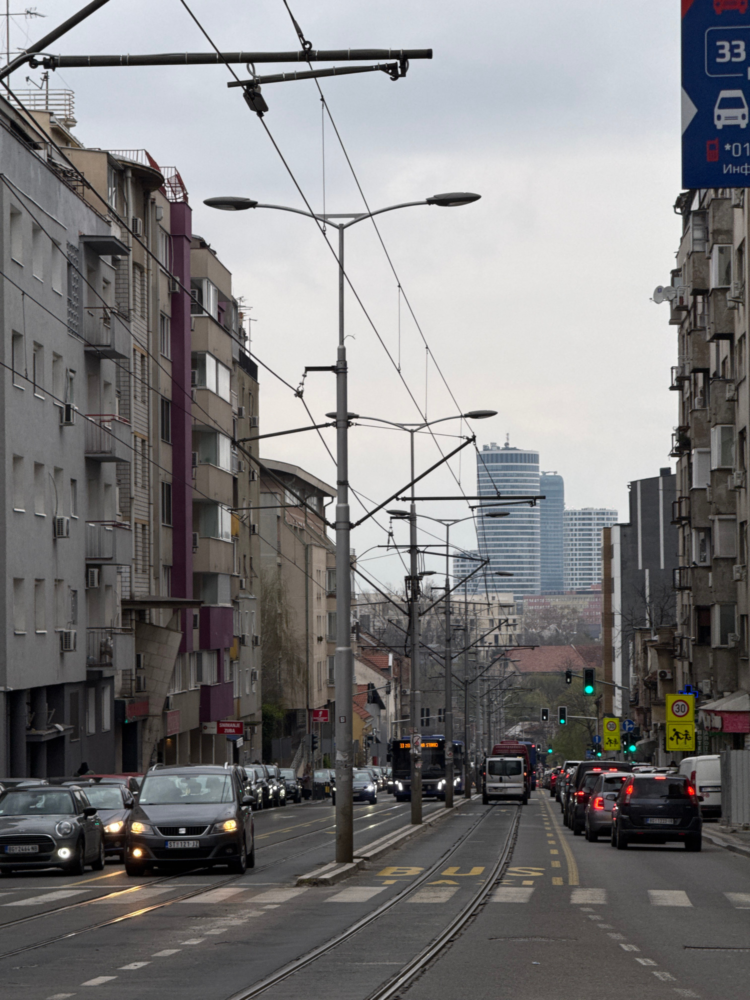 The image depicts a street in Vozdovac Urban Municipality, Serbia. The view is along a street with tram tracks running down the center. Traffic is present in both directions, with a line of cars on th…read more