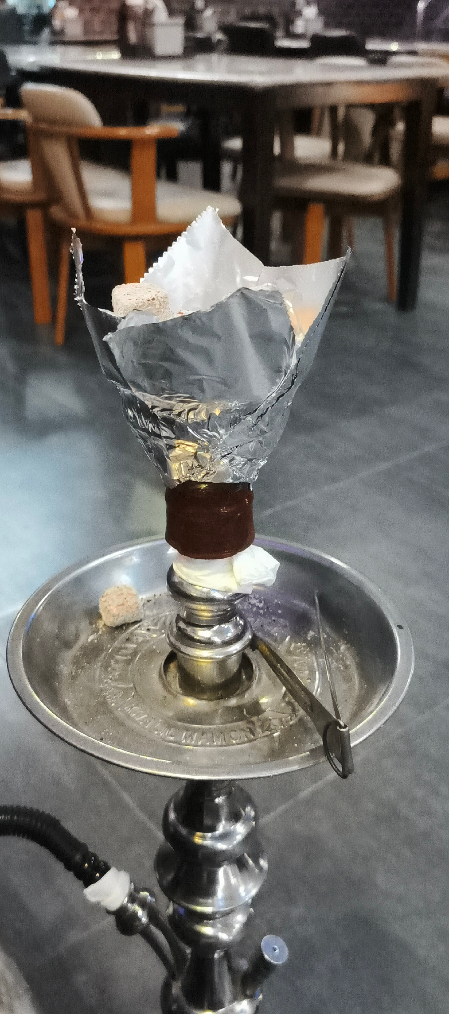 The image captures a close-up of a hookah (shisha) setup in what appears to be an indoor cafe or lounge in Bangkok, Thailand. The primary subject is the upper section of a silver-toned hookah. At the…read more