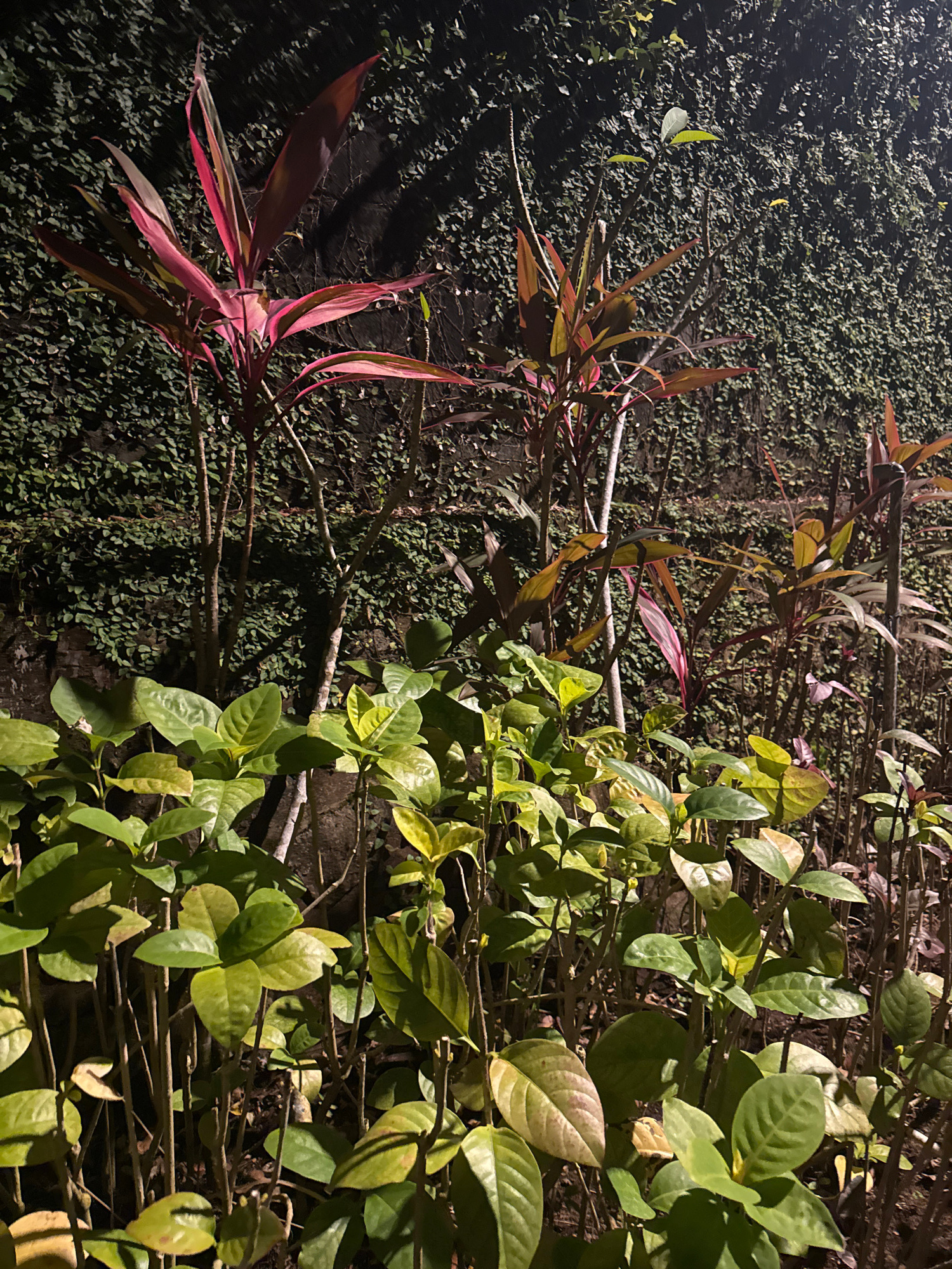 The image shows a wall covered in green climbing plants, with two distinct types of vegetation growing in front of it. On the left, there is a plant with red and green pointed leaves. On the right, th…read more