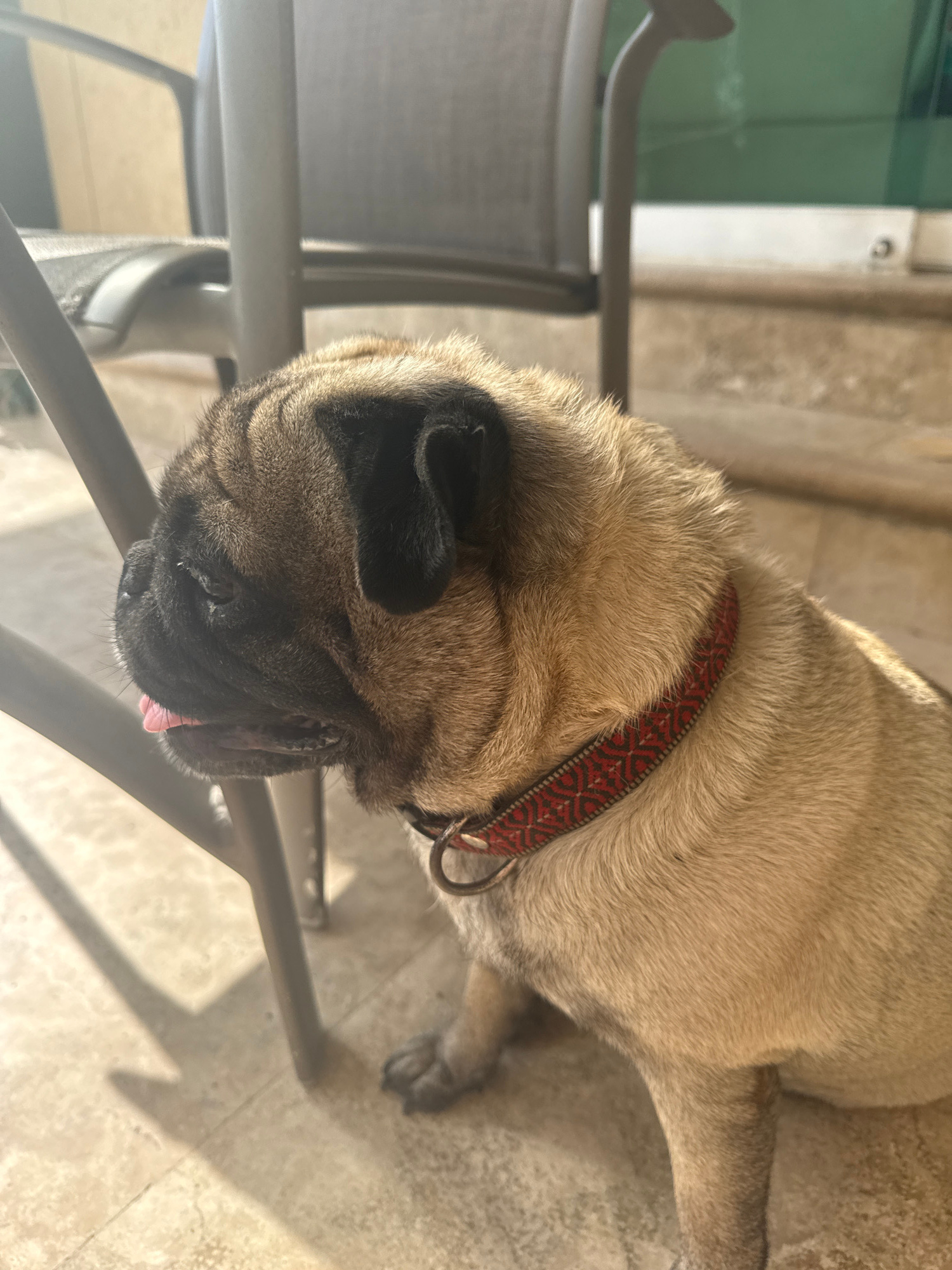 The image depicts a fawn-colored pug dog with a black muzzle and a red patterned collar. The dog is positioned on a gray metal chair, possibly outdoors, with its head leaning over the edge. A small po…read more