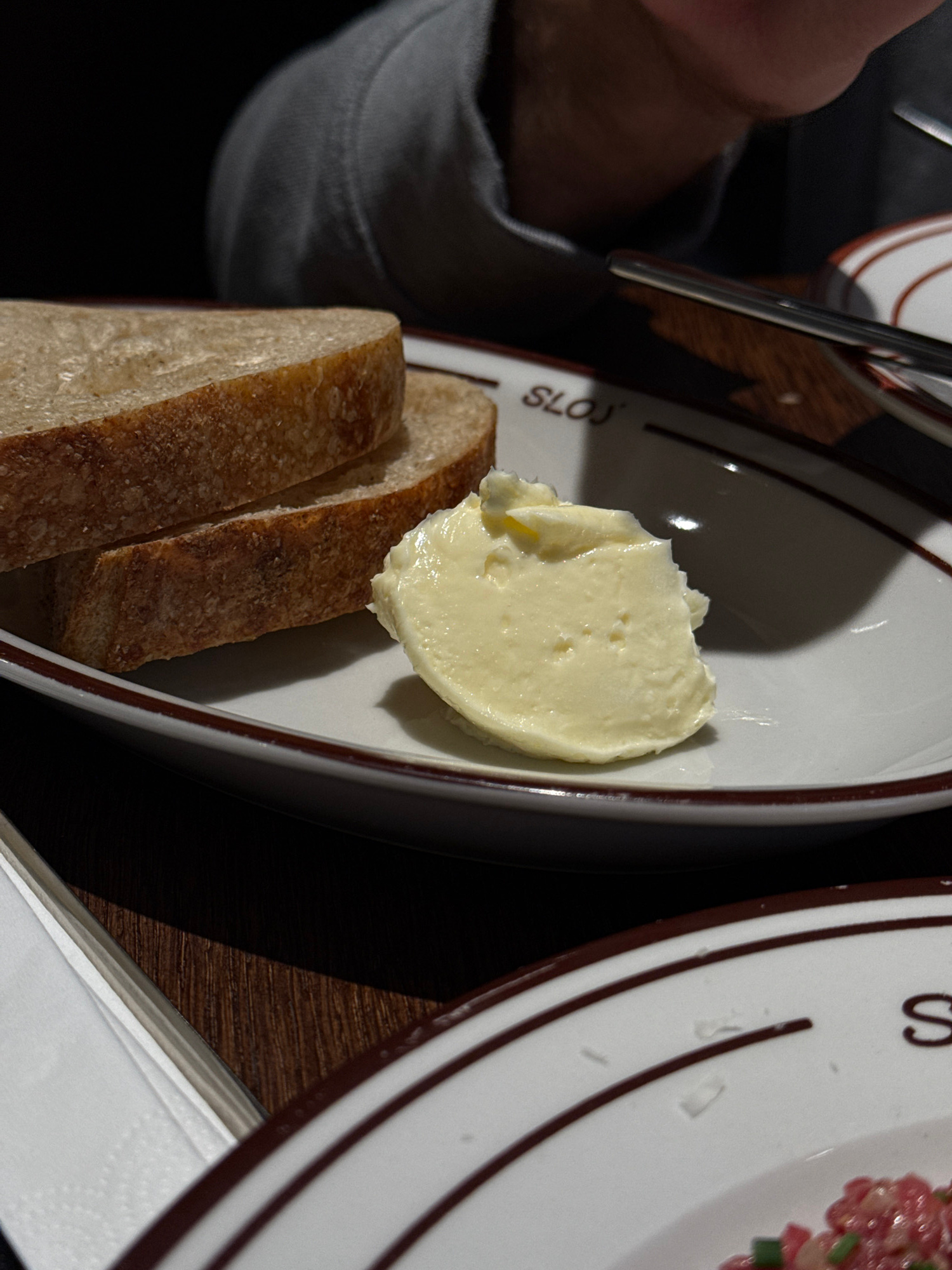 A close-up, dimly lit image depicts a dining table setup within a restaurant setting. In the foreground, a white, oval-shaped ceramic plate with a brown rim displays two slices of rustic bread and a roughly scooped portion of pale yellow butter. The word "SLOJ" in black capital letters is partially visible on the upper left side of this plate. To the immediate right, a portion of another identical plate is visible, containing a finely chopped, pinkish-red substance, likely a raw meat dish such as steak tartare. A person, identified by a visible portion of their chin and right arm clad in a grey long-sleeved garment, is seated at the table in the upper right background. A silver utensil, possibly a knife, rests on another identical plate in front of the person. The table surface is a dark brown wood with a visible grain. A folded white paper napkin is visible in the lower-left foreground. Based on the visible branding "SLOJ" on the plates, the location is identified as Sloj Restaurant, situated at Karađorđeva 44, Belgrade, Serbia. | Open Wire