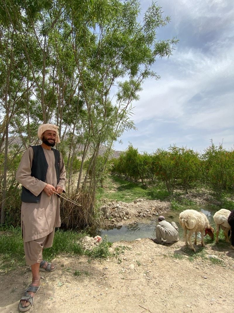 This outdoor scene in Deh Sabzi, Afghanistan, captures a rural landscape with people, animals, and lush greenery under a partly cloudy sky. In the foreground on the left, a man stands smiling, lookin…read more