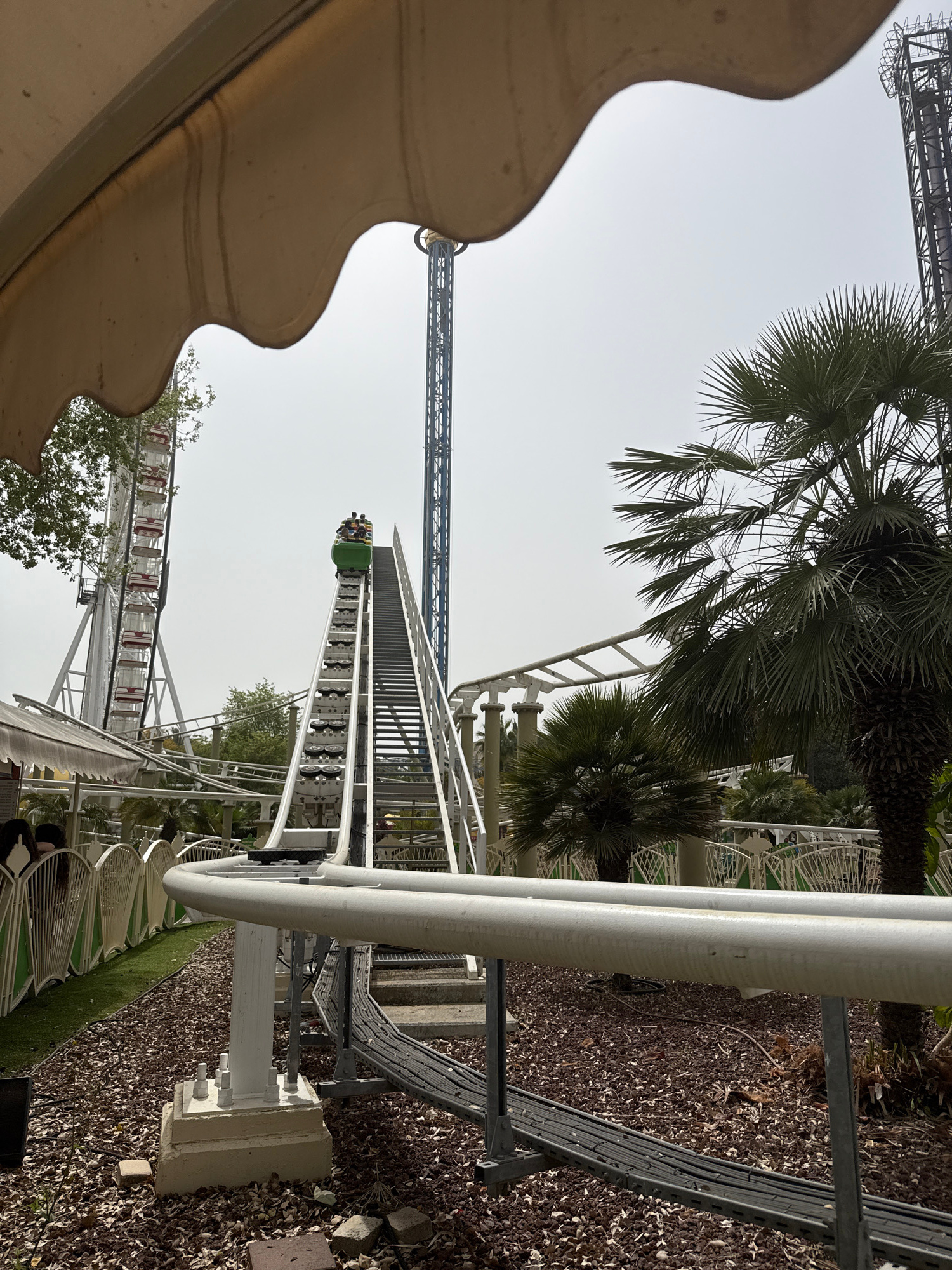 The image shows a roller coaster at Luna Gal amusement park in Tel Aviv, Israel. The coaster is ascending a steep incline, with a green car carrying several passengers visible near the top. The roller…read more