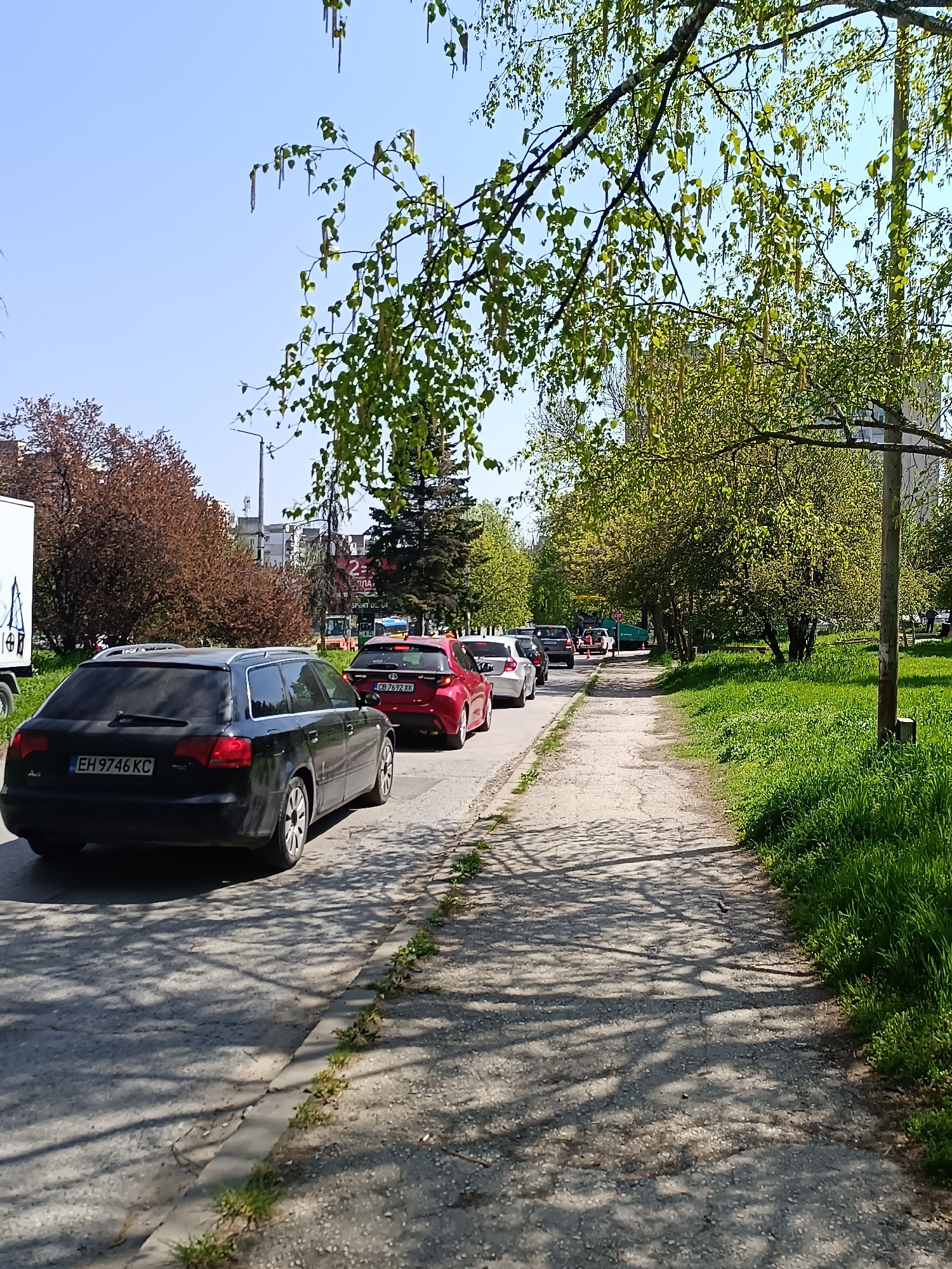 The image depicts a sunlit street scene in Pleven, Bulgaria, on a clear spring day. A line of vehicles is stationary on the asphalt road, suggesting a traffic stop or queue. In the foreground, a black…read more