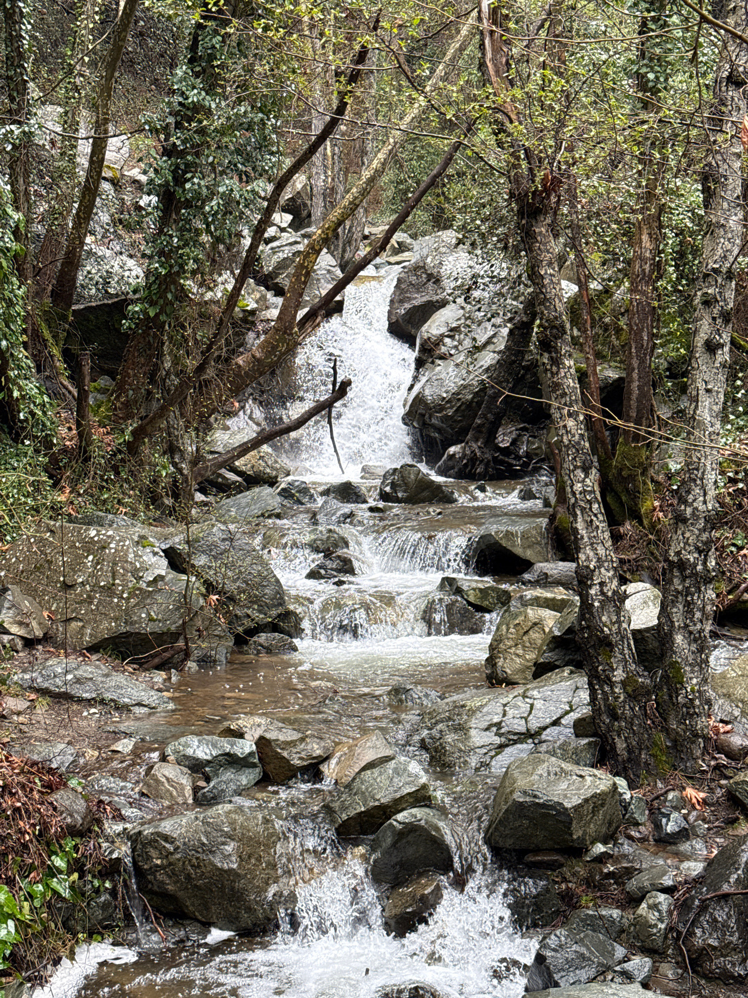 The image depicts a rocky waterfall flowing down a stream in a wooded area in Pano Platres, Cyprus. The water cascades over large, gray rocks and boulders. The surrounding environment is lush with tre…read more
