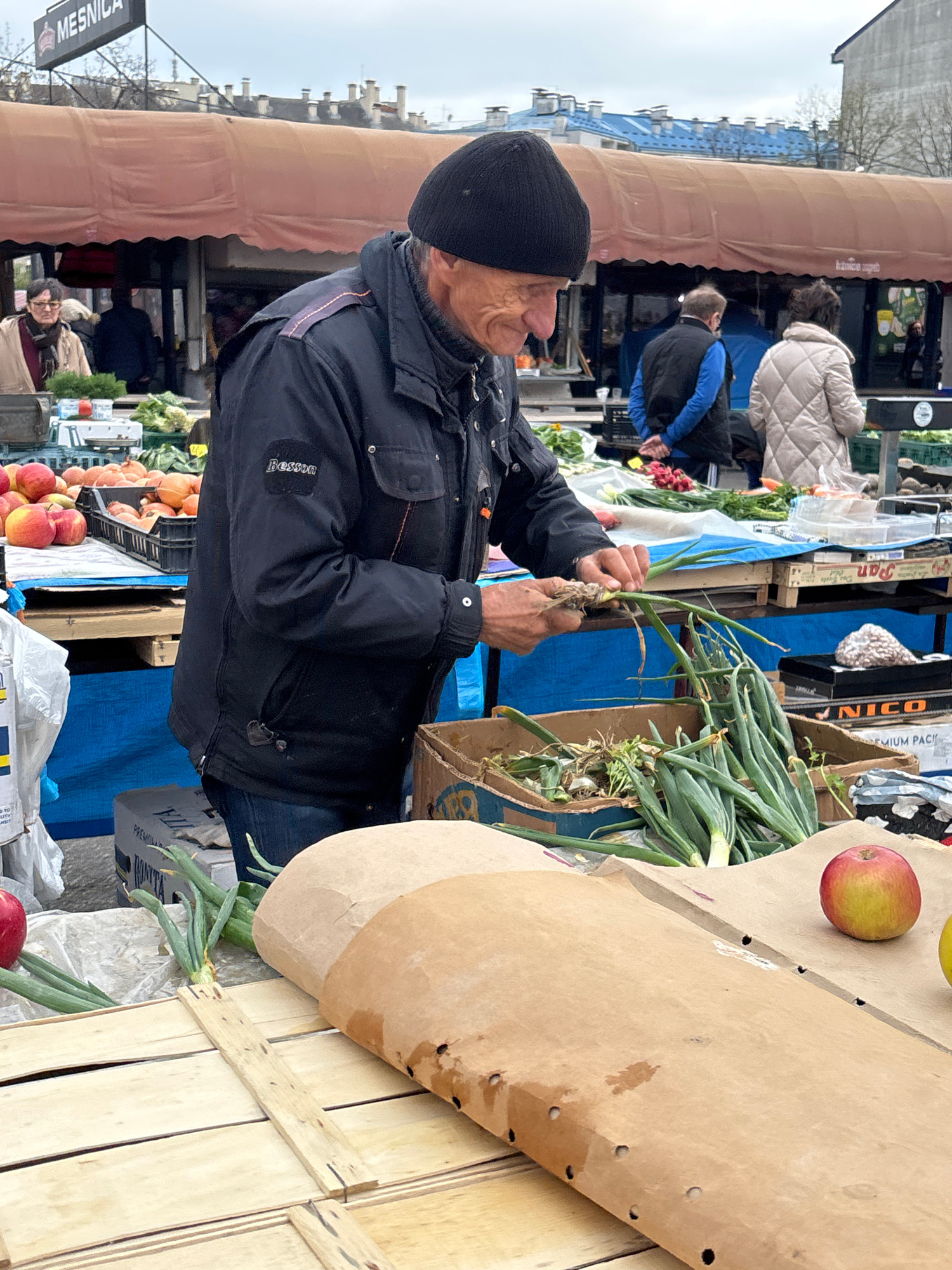 An eye-level, tilted, outdoor shot at a Zagreb, Croatia market shows an older man in a black beanie and jacket preparing green onions for sale. He stands behind a wooden table covered in various produ…read more