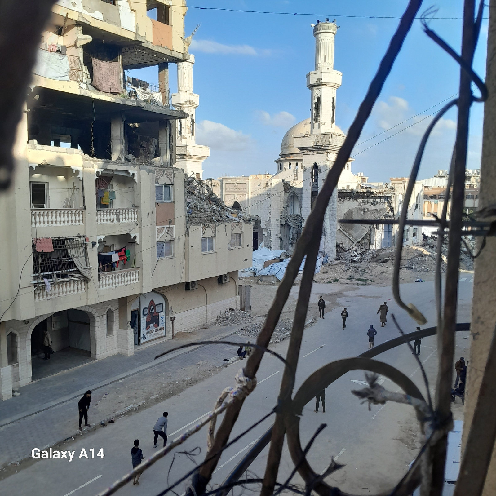 The image depicts a scene of urban destruction in Khan Yunis, Palestinian Territory. A partially destroyed building is visible, with exposed interiors and debris scattered around. A mosque with a prom…read more