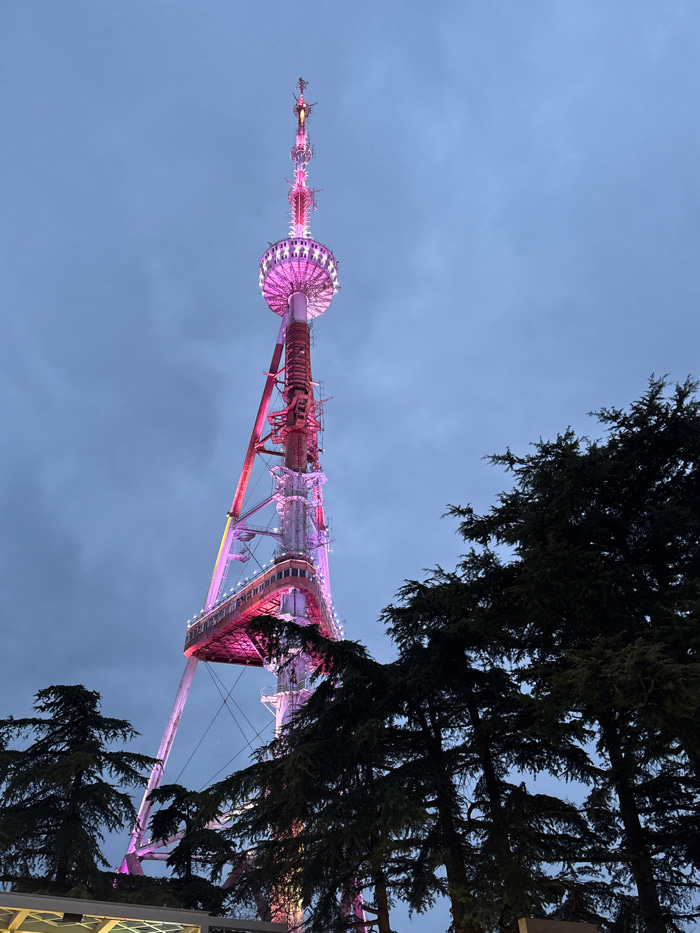 The image displays the Tbilisi TV Tower in Tbilisi, Georgia, illuminated with prominent pink and magenta lighting against an overcast, twilight sky. The tall, slender lattice steel structure of the to…read more
