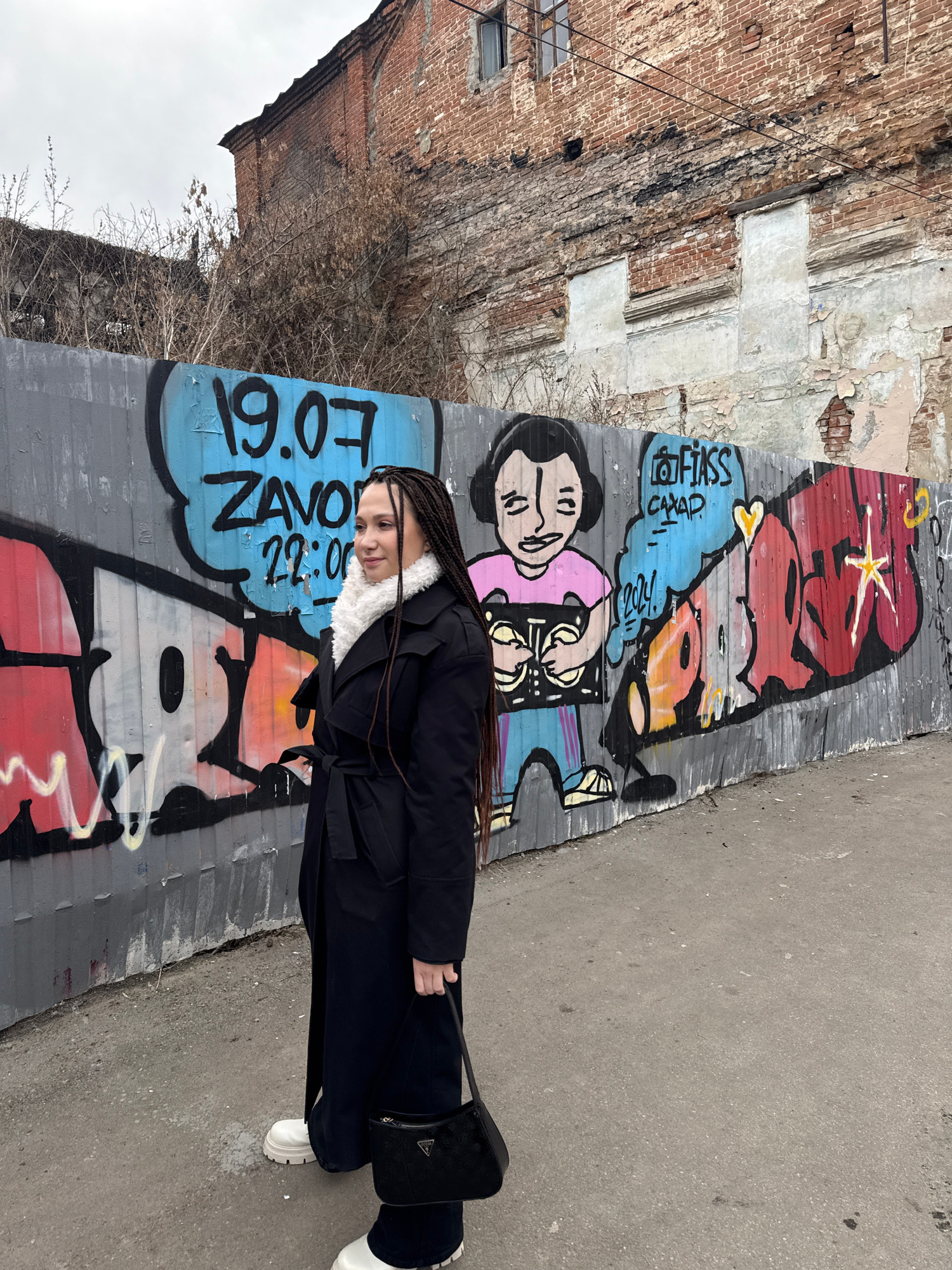 An outdoor, eye-level, full-length depiction of a young adult female on an asphalt surface in Saratov, Russia. The subject is positioned with her body slightly angled to the right, her head turned toβ¦read more