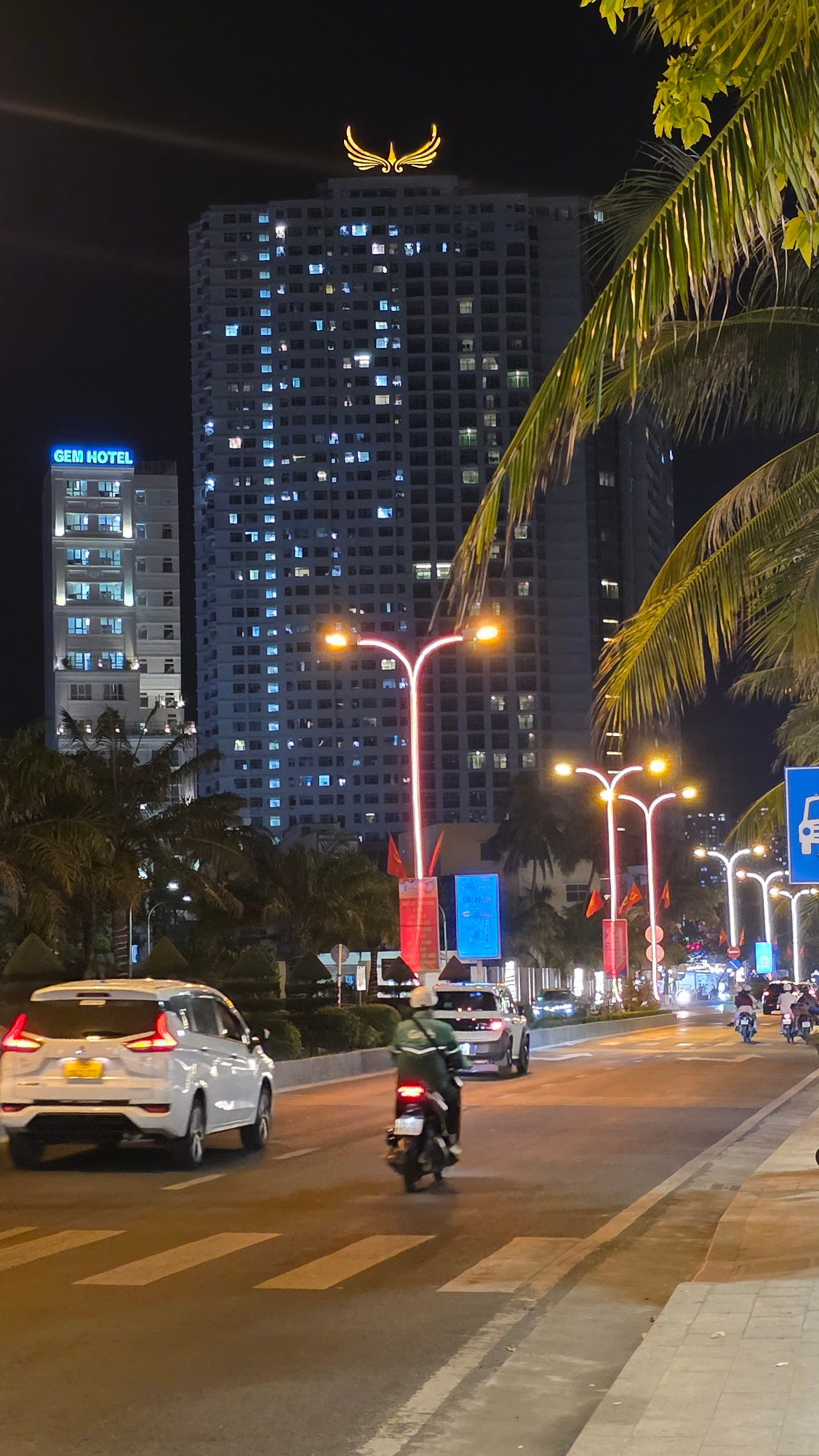 This night-time image captures a bustling urban street scene, likely in Nha Trang, Vietnam, at a slight diagonal angle. On the left side of the frame, a towering, modern building dominates, its facade…read more