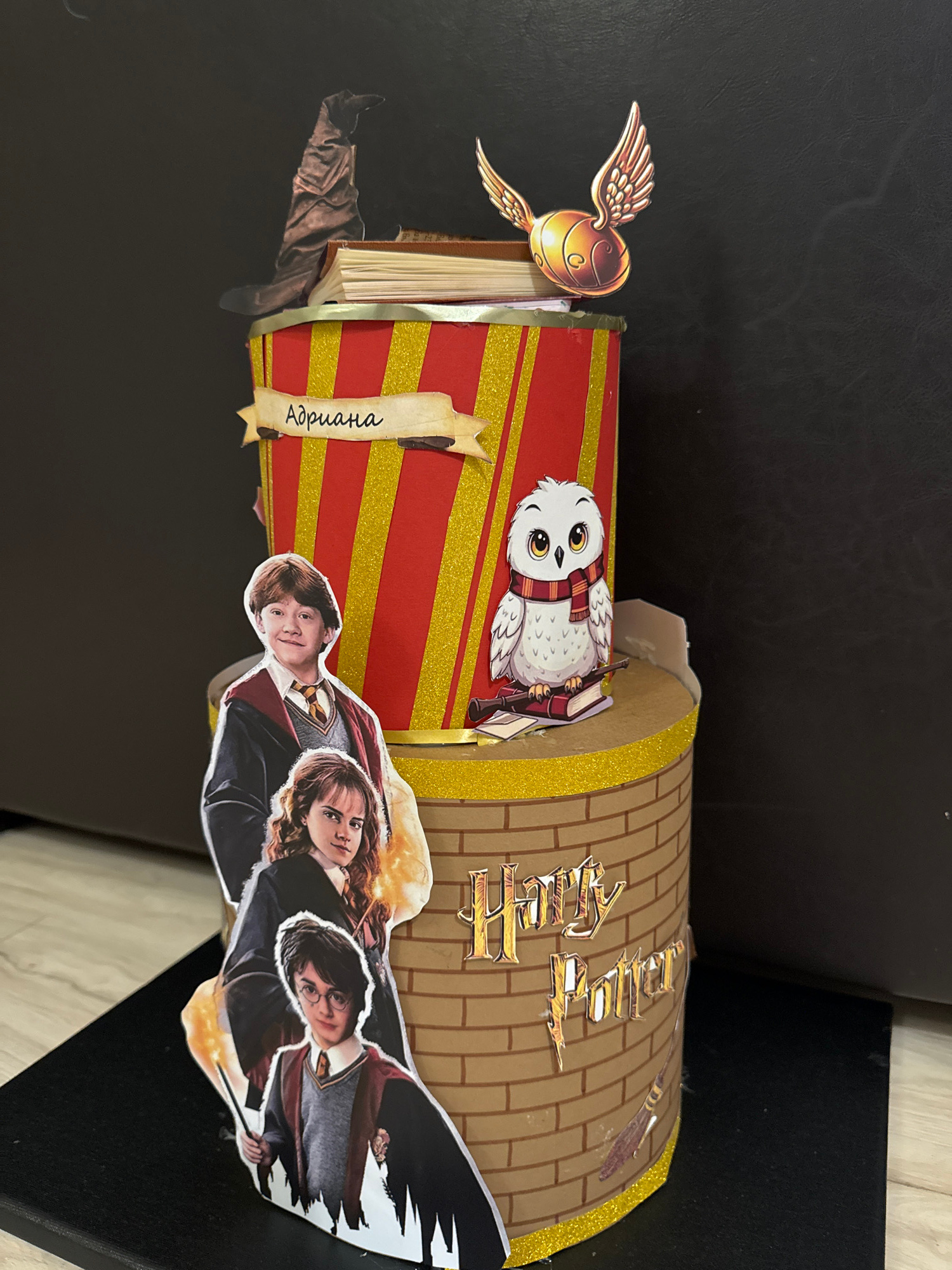 A homemade three-tiered craft project sits on a black surface. The tiers appear to be constructed from cylindrical cardboard containers. The bottom tier is decorated with a brick pattern and the word…read more