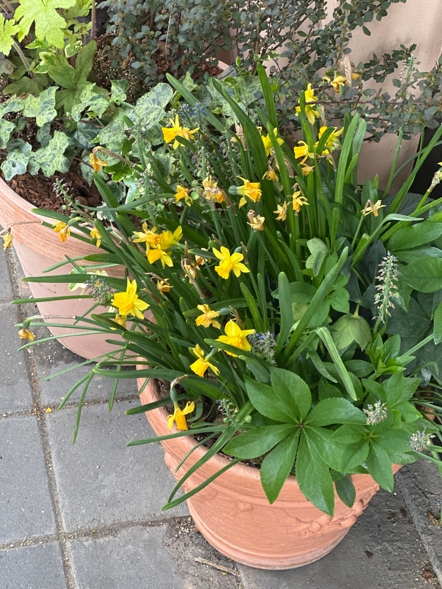 A high-angle shot shows a terracotta planter filled with various plants on a paved surface, likely a sidewalk or patio. The planter contains yellow daffodils, ivy, and leafy green plants. The planter…read more