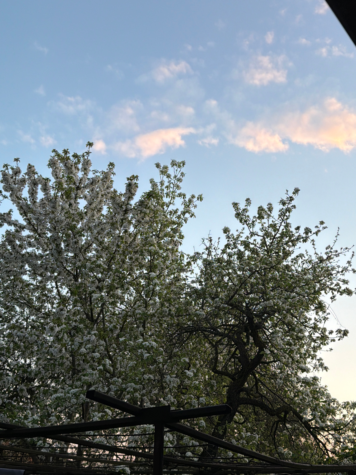 The image is an upward-angled shot of a blooming tree against a partly cloudy blue sky. The tree's branches are laden with white blossoms. A structure with black support beams is partially visible on…read more