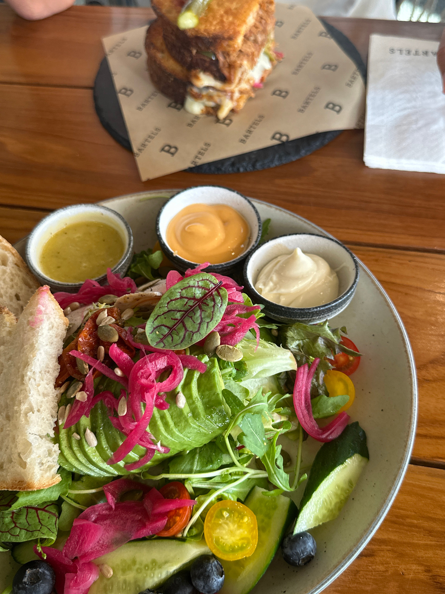 The image shows a plate of food, likely taken at a restaurant in Choeng Thale, Thailand, given the context. The food consists of a salad with avocado, pickled red onions, lettuce, tomatoes, cucumber,…read more